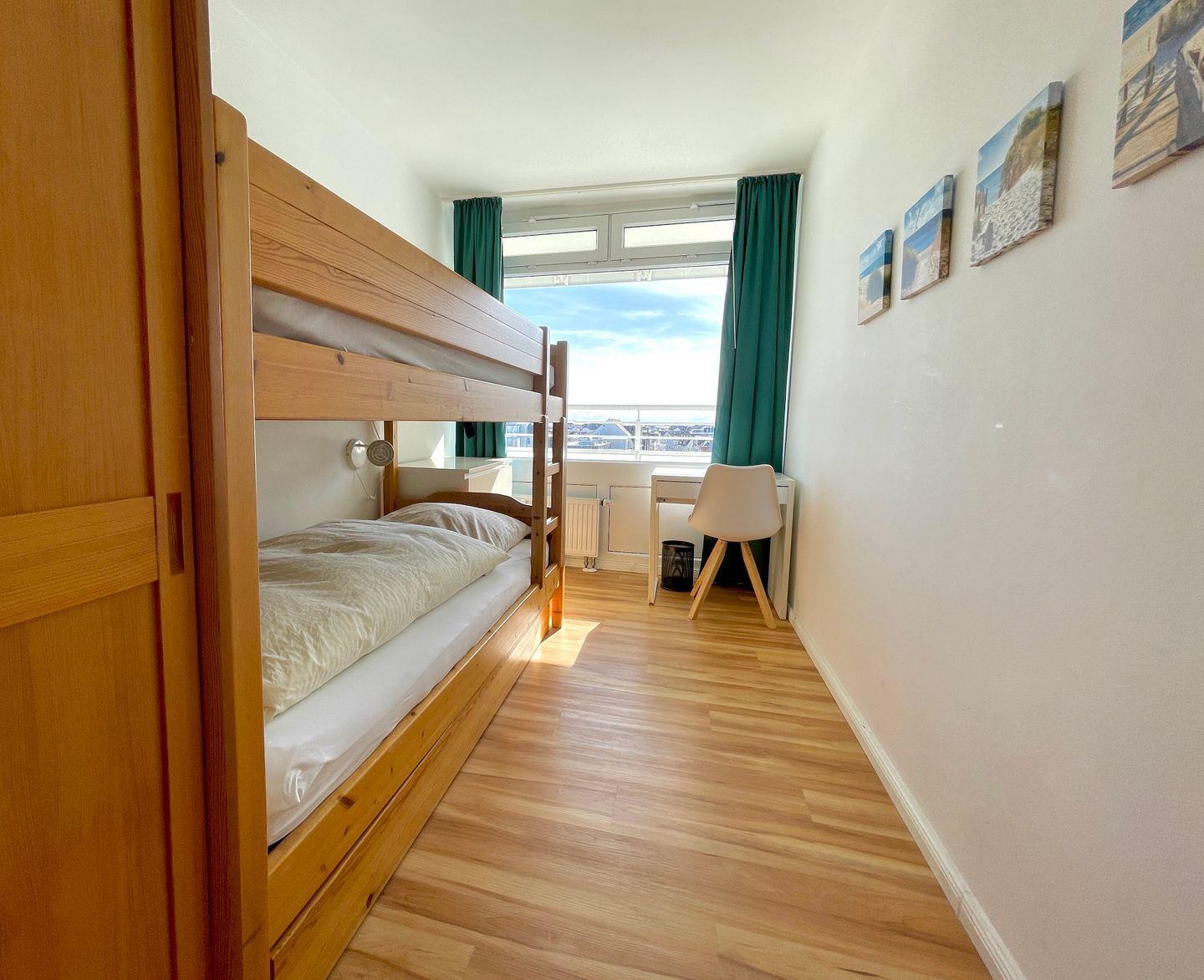 Das Schlafzimmer ist mit einem komfortablen Doppelbett, einer geräumigen Kommode und einem separat begehbaren Kleiderschrank ausgestattet. Das angrenzende Kinderzimmer bietet ein großes Etagenbett, eine Kommode und einen Schrank – ideal für Familien.