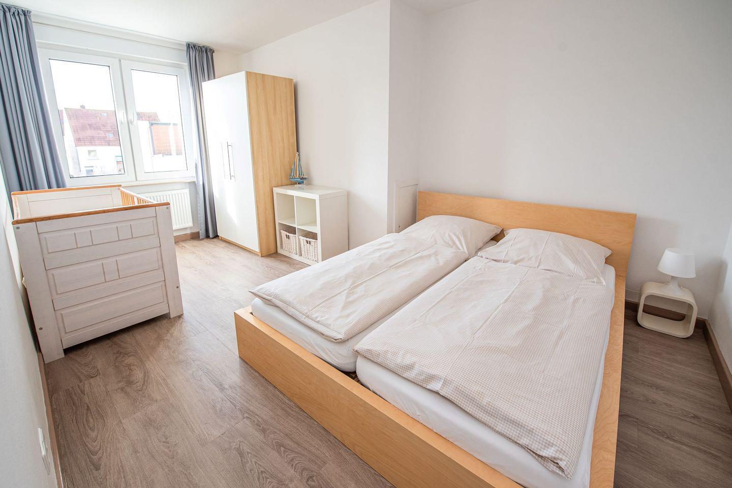 In einem der Schlafzimmer befindet sich zusätzlich ein stabiles Gitterbett. Die Schlafzimmer lassen sich mit einer Jalousie verdunkeln.