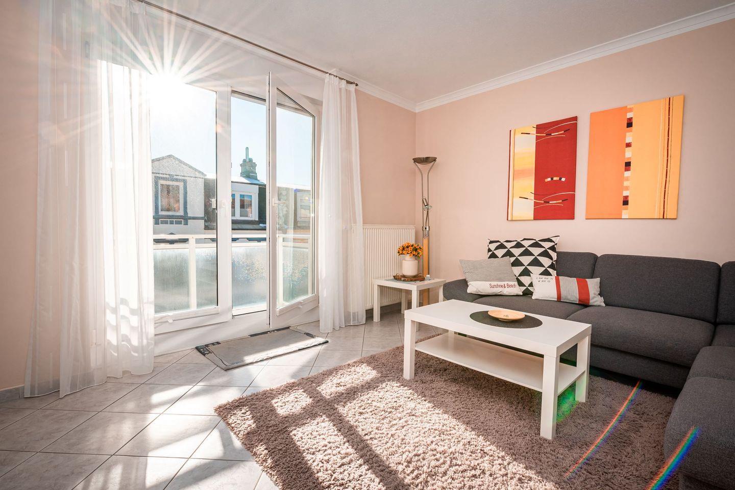 Diese großzügige Zweiraumwohnung im 2. Obergeschoss bietet auf ca. 55 m² modernen Komfort und ein stilvolles Ambiente. Der helle, geflieste Wohnraum ist allergikerfreundlich gestaltet und durch einen eleganten Tresen optisch vom Küchenbereich getrennt. Hier befindet sich ein Schrankdoppelbett, das sich bei Bedarf für weitere Gäste ausklappen lässt.