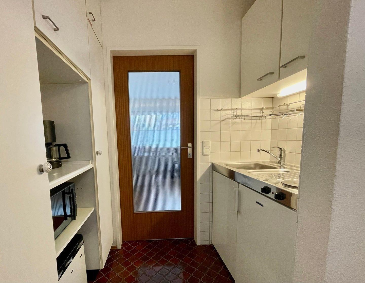 Die in den Flur integrierte Küchenzeile ist mit einen 2 Platten Kocher, Kühlschrank, Kaffeemaschine Toaster etc. ausgestattet.