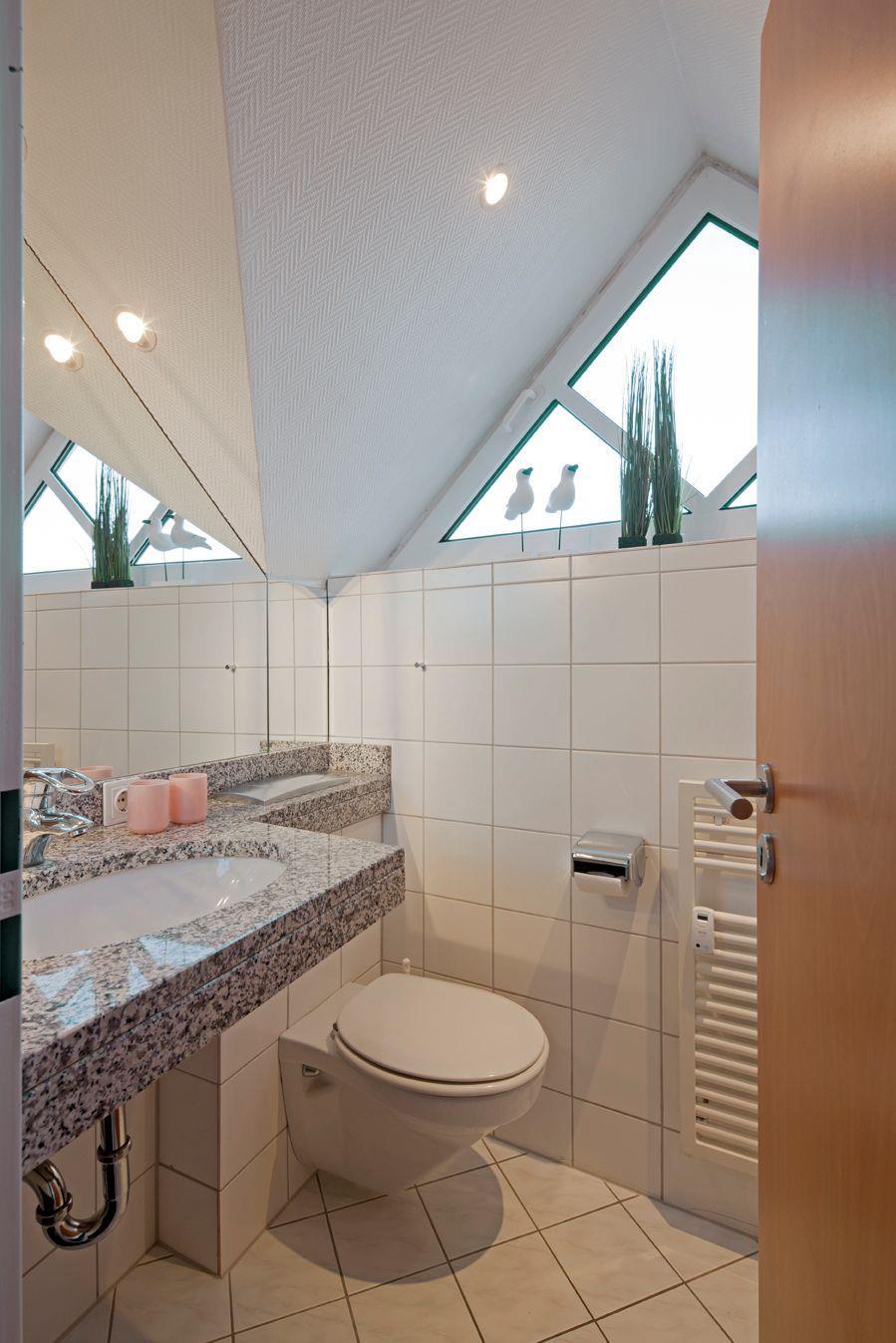 Das Bad mit Fenster ist modern eingerichtet und verfügt über eine Dusche mit flachem Einstieg und ein WC sowie einen Handtuchtrockner.