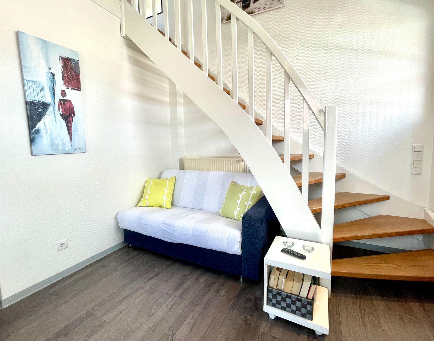 Das Bonbon dieser Ferienwohnung ist die Schlafempore, auf der sich ein französisches Bett (1,40 x 2,00 m) unter einer Schräge befindet und welche über eine im Wohnraum integrierte Treppe zu erreichen ist.
