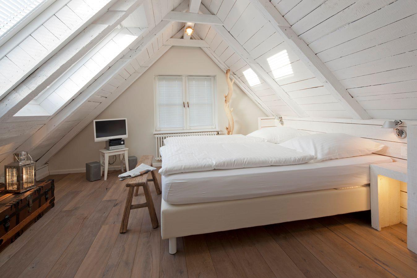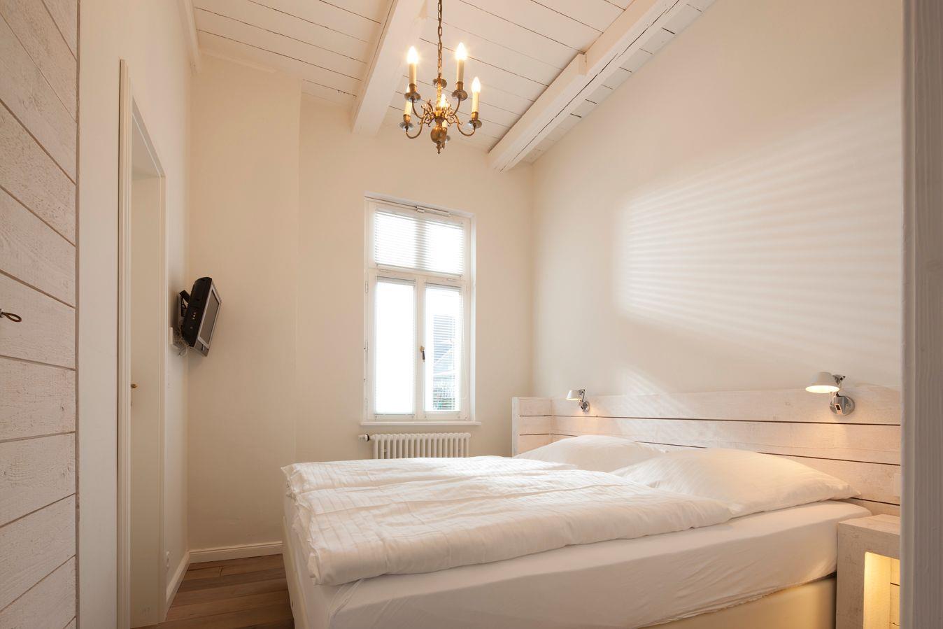 In dem anderen befindet sich ein großes Doppelbett und von hier kann man durch die schrägen Fenster in der Nacht die Sterne oder morgens den heller werdenden Himmel betrachten. Hier steht als Einschlafhilfe auch noch ein zweiter Fernseher mit Flachbildschirm.