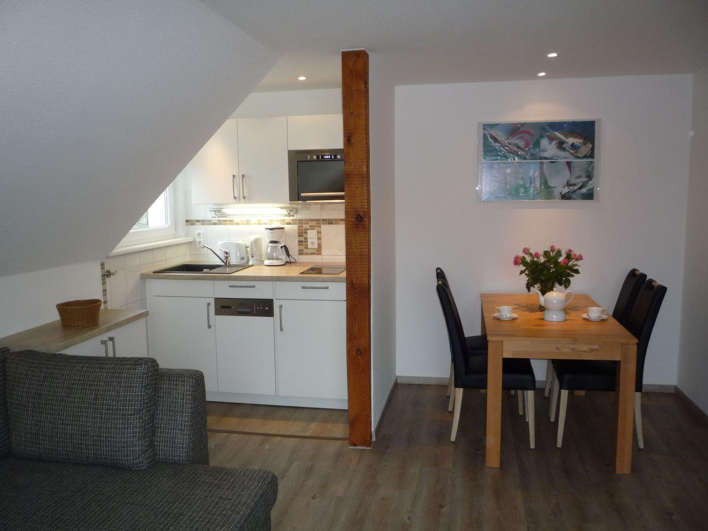 Eine 2-Raum-Ferienwohnung mit teilweise schrägen Wänden, für max. 3 Personen im 1. OG mit ca. 45 m² Wohnfläche.