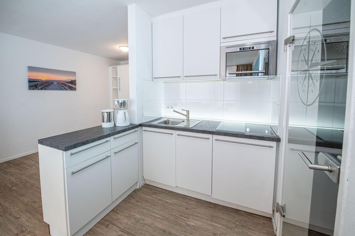 Die integrierte Küchenzeile im Wohnbereich ist komplett eingerichtet und verfügt über alles, was man für die Selbstversorgung braucht. Direkt davor befindet sich ein Essbereich, der genügend Platz für ein ausgiebiges Frühstück bietet.