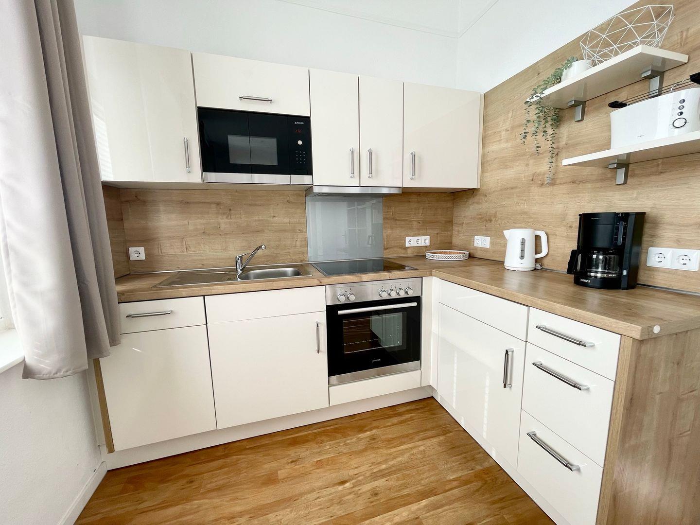 4-Platten-Cerankochfeld, Mikrowelle, Geschirrspüler, Kaffeemaschine, Toaster und Wasserkocher – ideal für Selbstversorger, die auf Komfort nicht verzichten möchten.