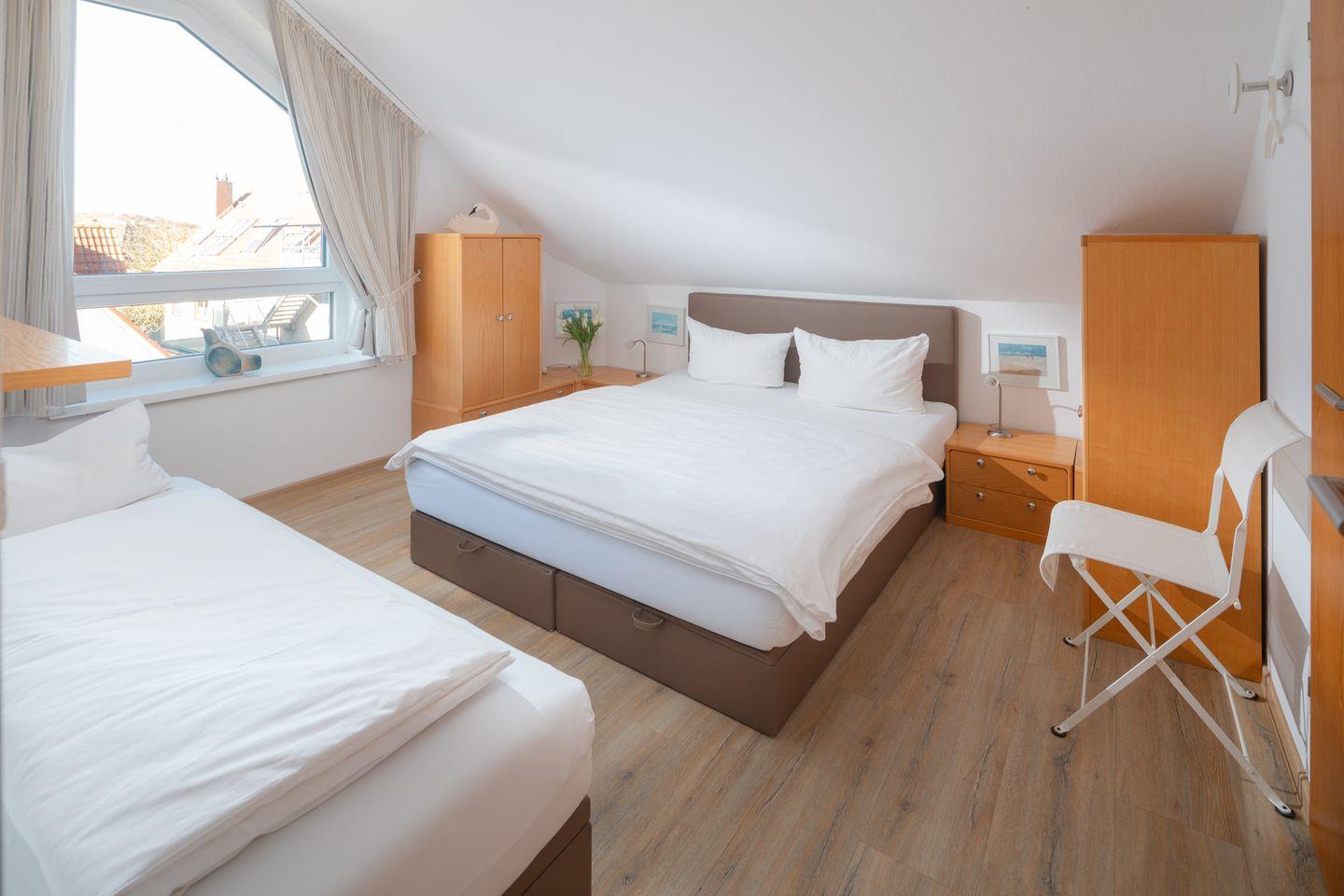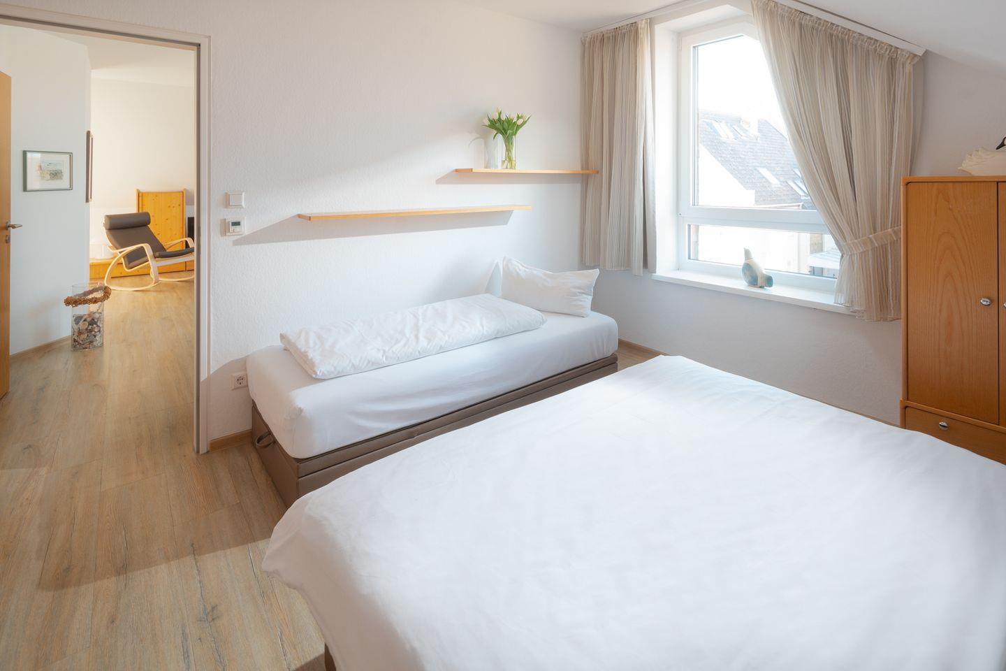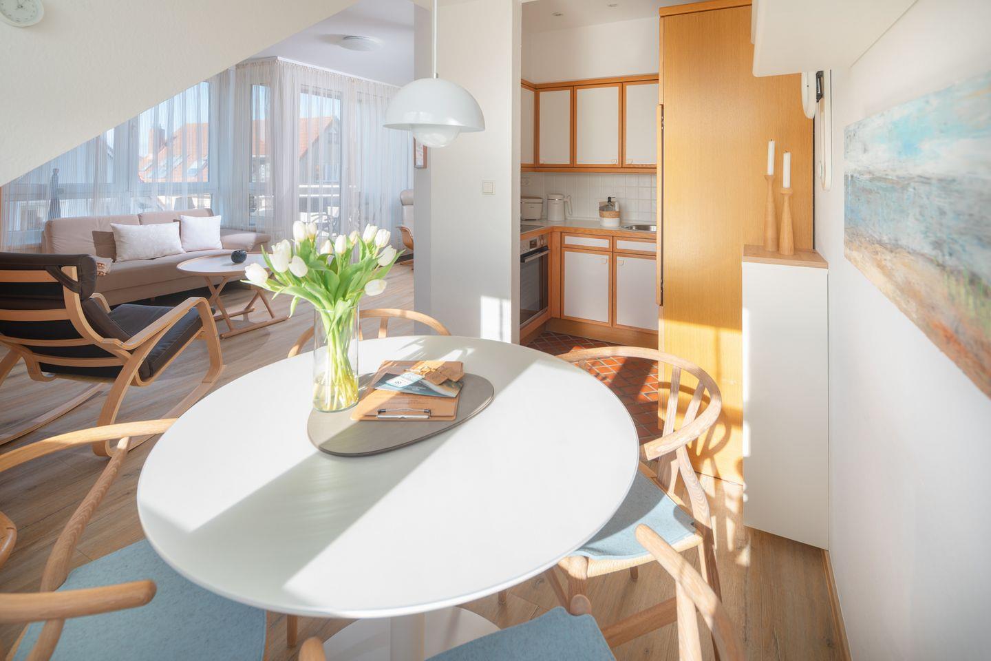 In der Wohnung Dünensand finden Sie drei Schlafmöglichkeiten in Form eines Doppelbettes (160x200cm) sowie einem Einzelbett (90x200cm). Im gemütlichen Wohn-und Essbereich lässt sich der Urlaubstag ausklingen, von hier aus gelangen Sie auf den Balkon südlicher Ausrichtung.