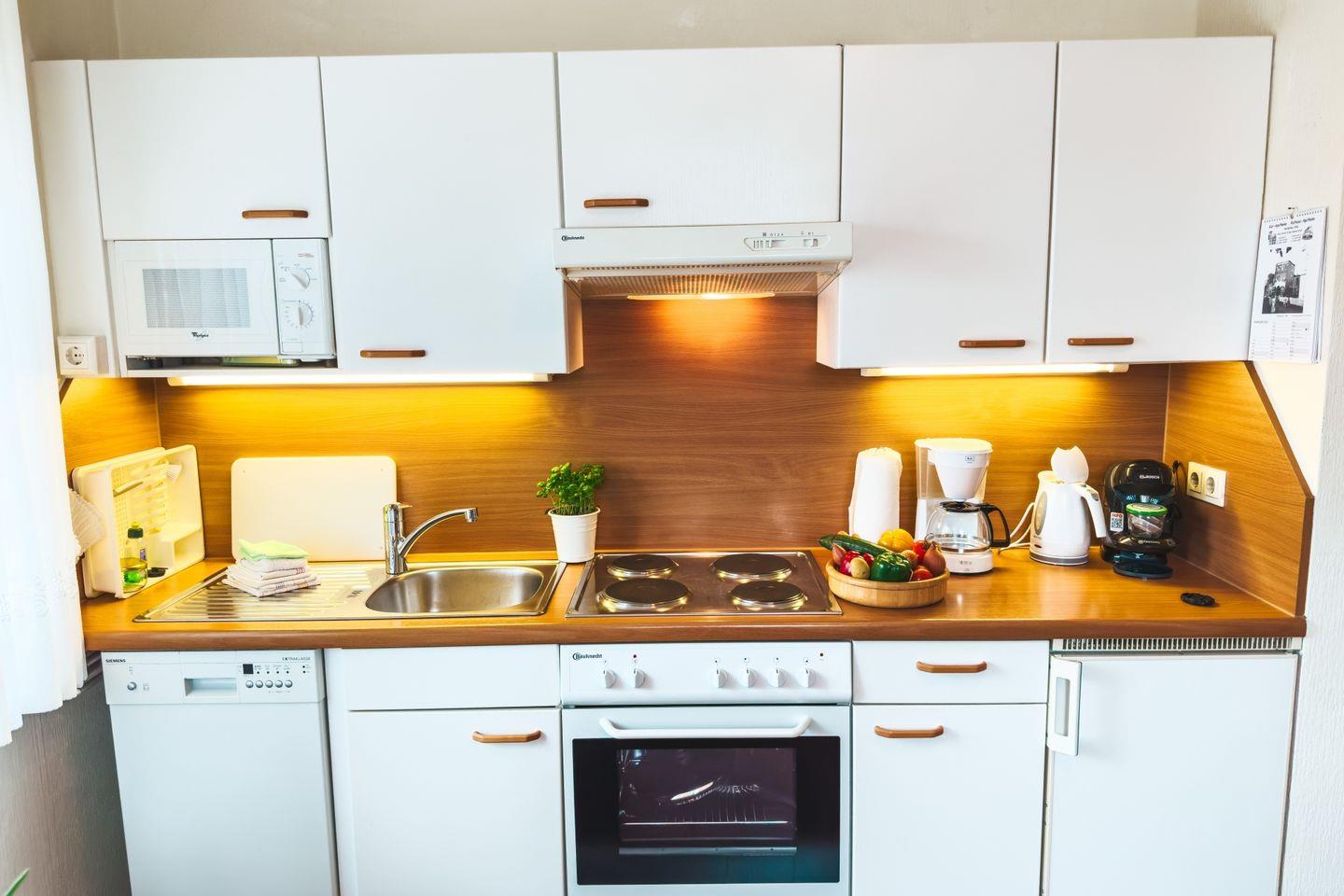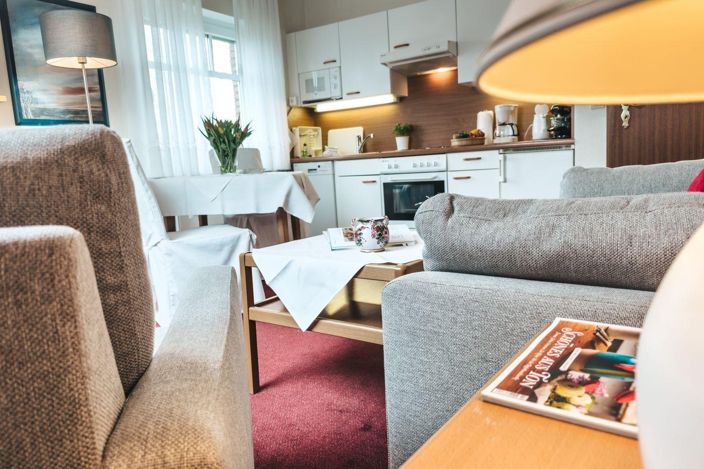 Das Wohnzimmer ist hell und freundlich gestaltet und lädt zum Entspannen ein. Hier finden Sie ein bequemes Sofa, einen Esstisch sowie einen Sessel, perfekt für gemütliche Abende vor dem Fernseher oder für gesellige Essen. Die komplett ausgestattete Küche mit offener Gestaltung zum Wohnbereich lässt keine Wünsche offen: Sie erwartet eine 4-Platten-Herd, Backofen, Mikrowelle, Kühlschrank mit Gefrierfach, Spülmaschine und eine Espressomaschine, damit Sie schon morgens mit einem frisch gebrühten Kaffee den Tag beginnen können. Selbstverständlich ist die Küche mit Geschirr und Besteck sowie allen notwendigen Küchenutensilien ausgestattet.