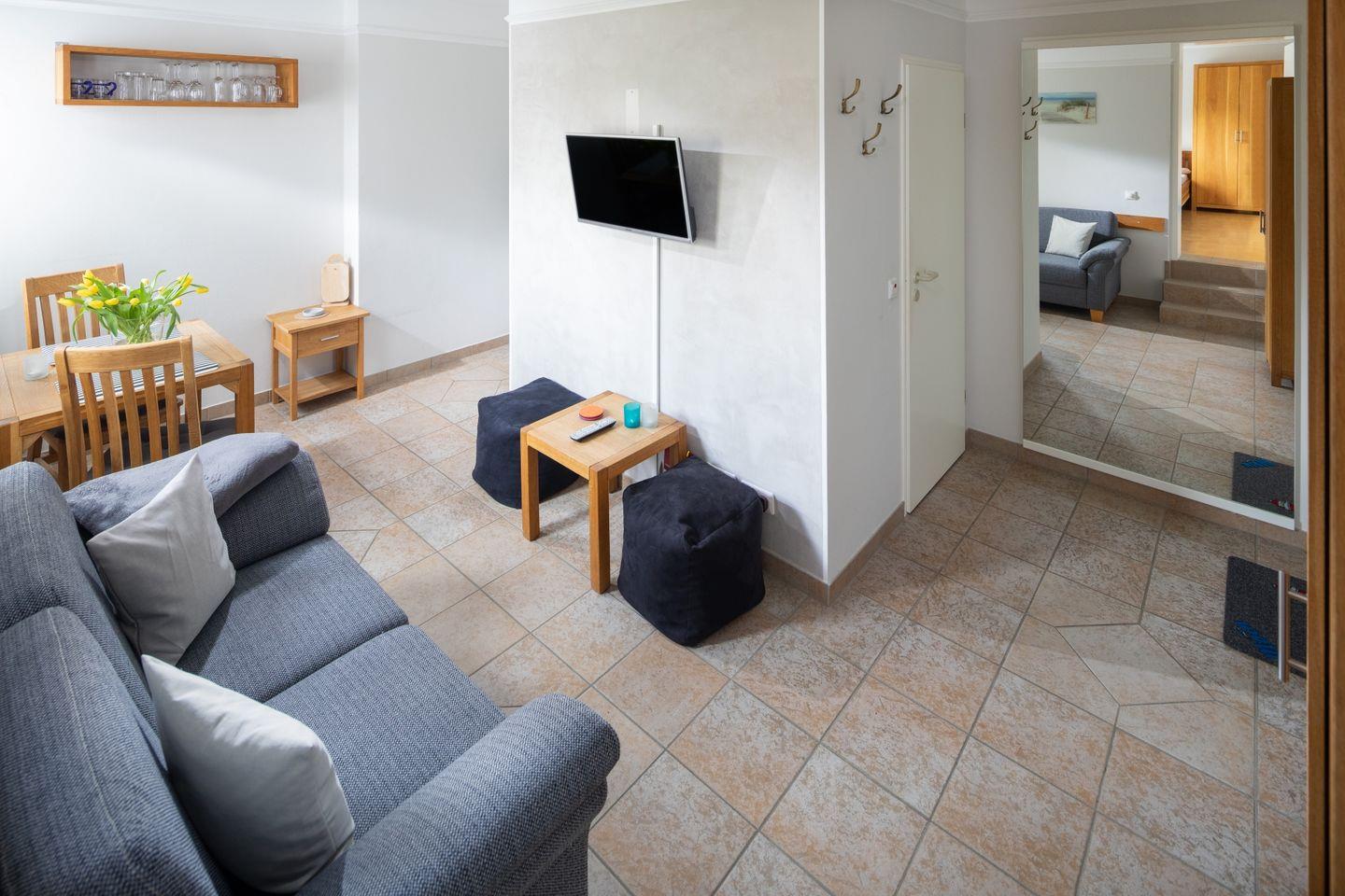 Im Wohnbereich erwartet Sie ein bequemes Sofa, das ideal ist, um nach einem erlebnisreichen Tag zu entspannen. Schalten Sie den TV ein oder nutzen Sie das WLAN, um mit Freunden und Familie in Kontakt zu bleiben oder Ihre Urlaubsfotos hochzuladen. Die Fenster sorgen für eine helle und freundliche Atmosphäre und bieten Ihnen eine herrliche Aussicht auf die grünen Umgebung.