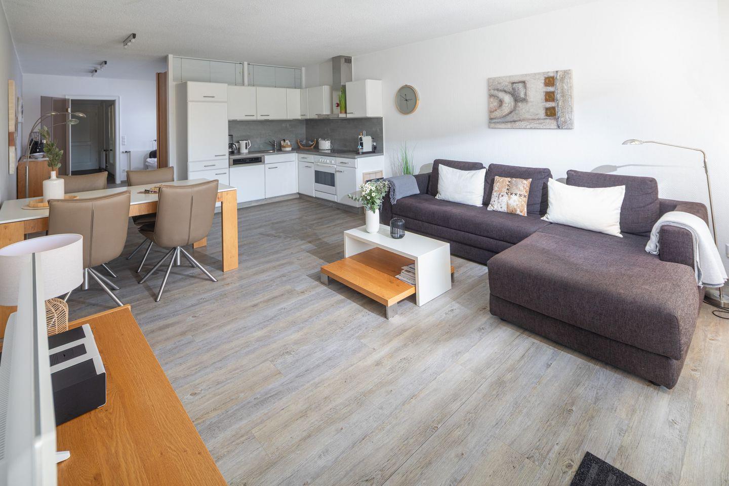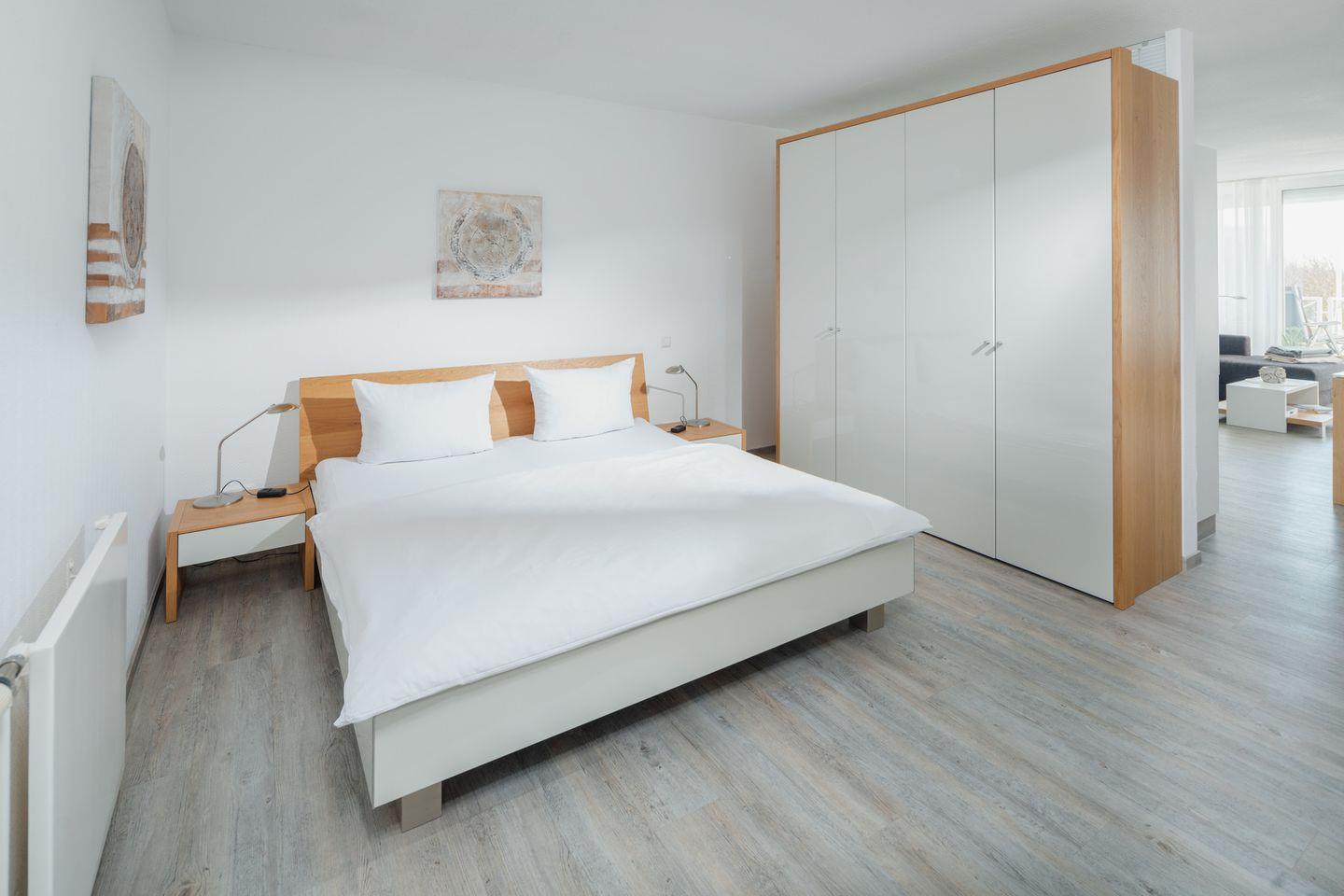 Das komfortable 180x200cm breite Doppelbett sorgt für eine erholsame Nachtruhe. Die Wohnung ist mit einem Fahrstuhl erreichbar und das offene Wohnkonzept verleiht ihr ein luftiges und helles Ambiente.