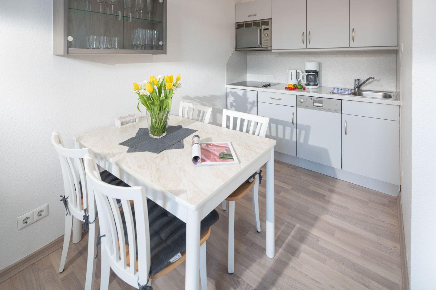 Die Ferienwohnung ist modern und geschmackvoll eingerichtet. Sie betreten die Wohnung und werden sofort von der warmen Atmosphäre empfangen. Der offene Küchenbereich ist mit sämtlichen Annehmlichkeiten ausgestattet. Hier finden Sie einen Herd, eine Mikrowelle, eine Spülmaschine und einen Kühlschrank mit Gefrierfach – alles, was Sie brauchen, um köstliche Mahlzeiten zuzubereiten. Der Essbereich mit einem einladenden Esstisch ermöglicht es Ihnen, entspannte Abende bei einem gemeinsamen Essen zu verbringen.