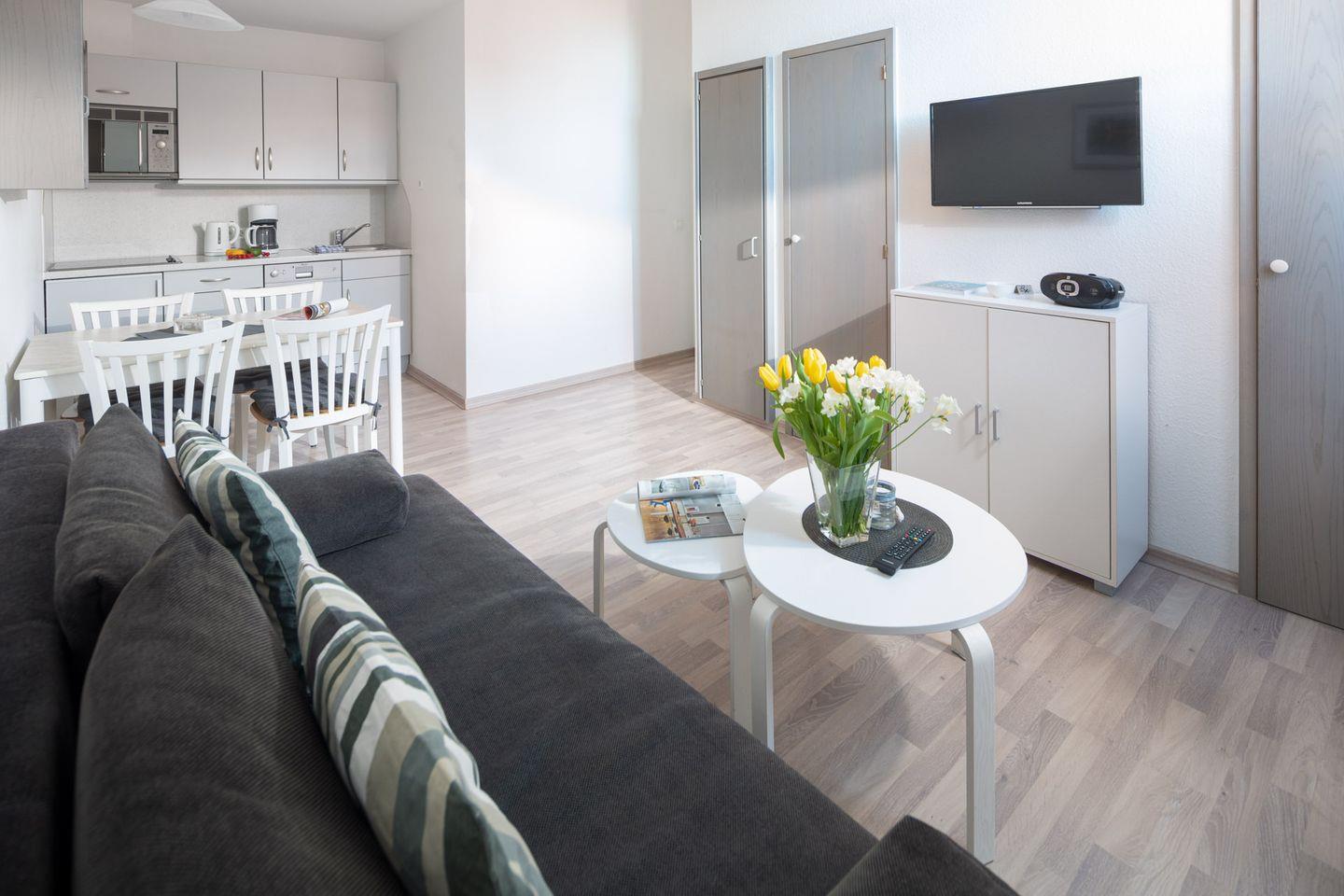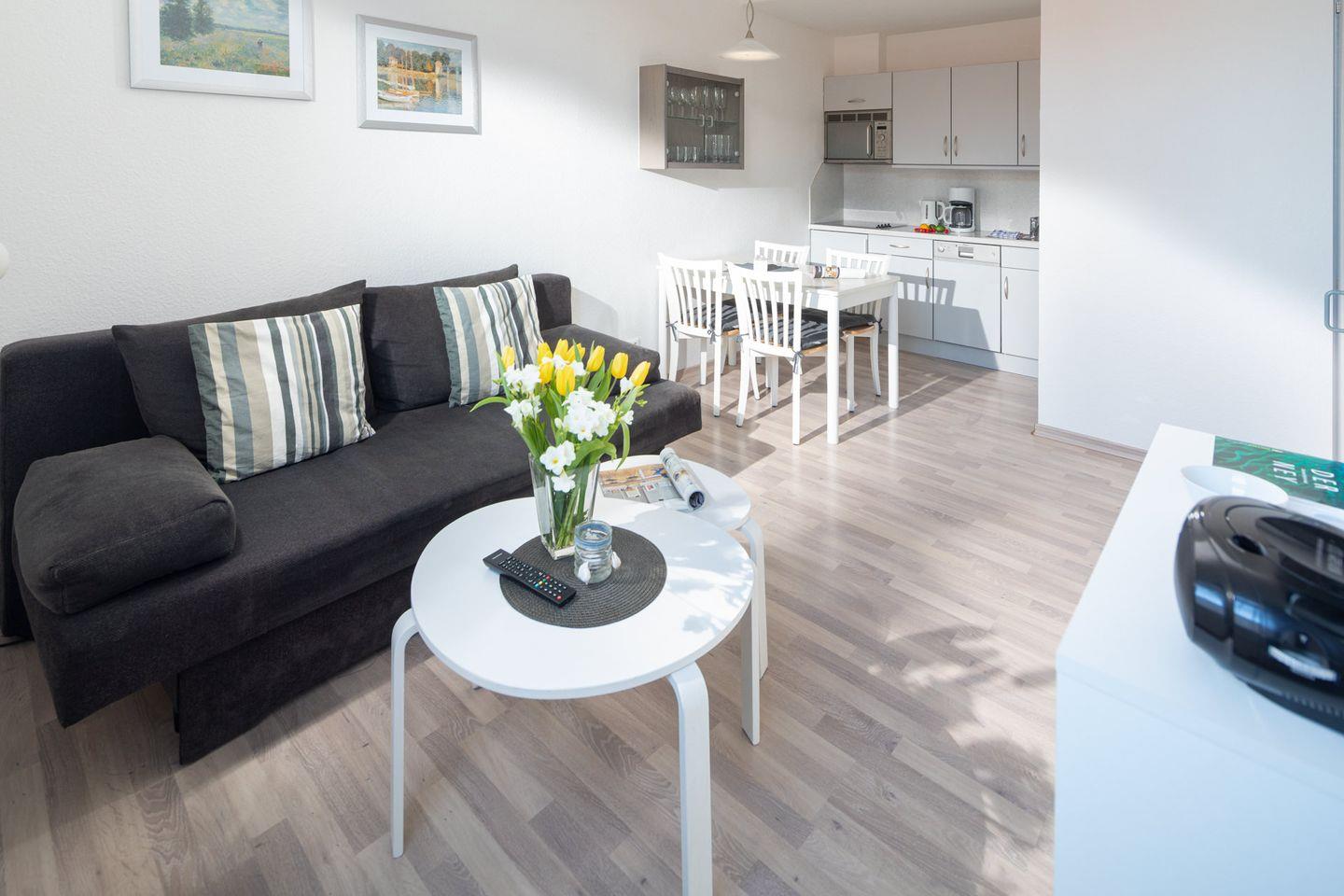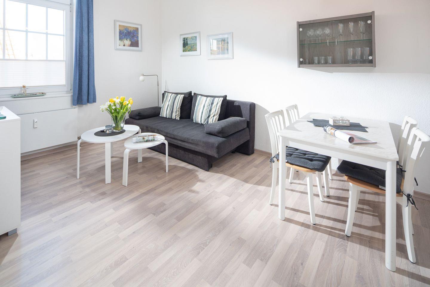 Das Wohnzimmer der Wohnung besticht durch seinen hellen und freundlichen Charme. Das Laminat sorgt für eine gemütliche Atmosphäre und Hygiene. Hier können Sie sich auf dem bequemen Sofa entspannen, fernsehen oder im WLAN surfen, das Ihnen in der gesamten Wohnung zur Verfügung steht. Ein Fernseher (25-34 Zoll) mit Kabelanschluss sorgt dafür, dass Sie auch während Ihres Urlaubs in der Lage sind, Ihre Lieblingssendungen zu verfolgen.
