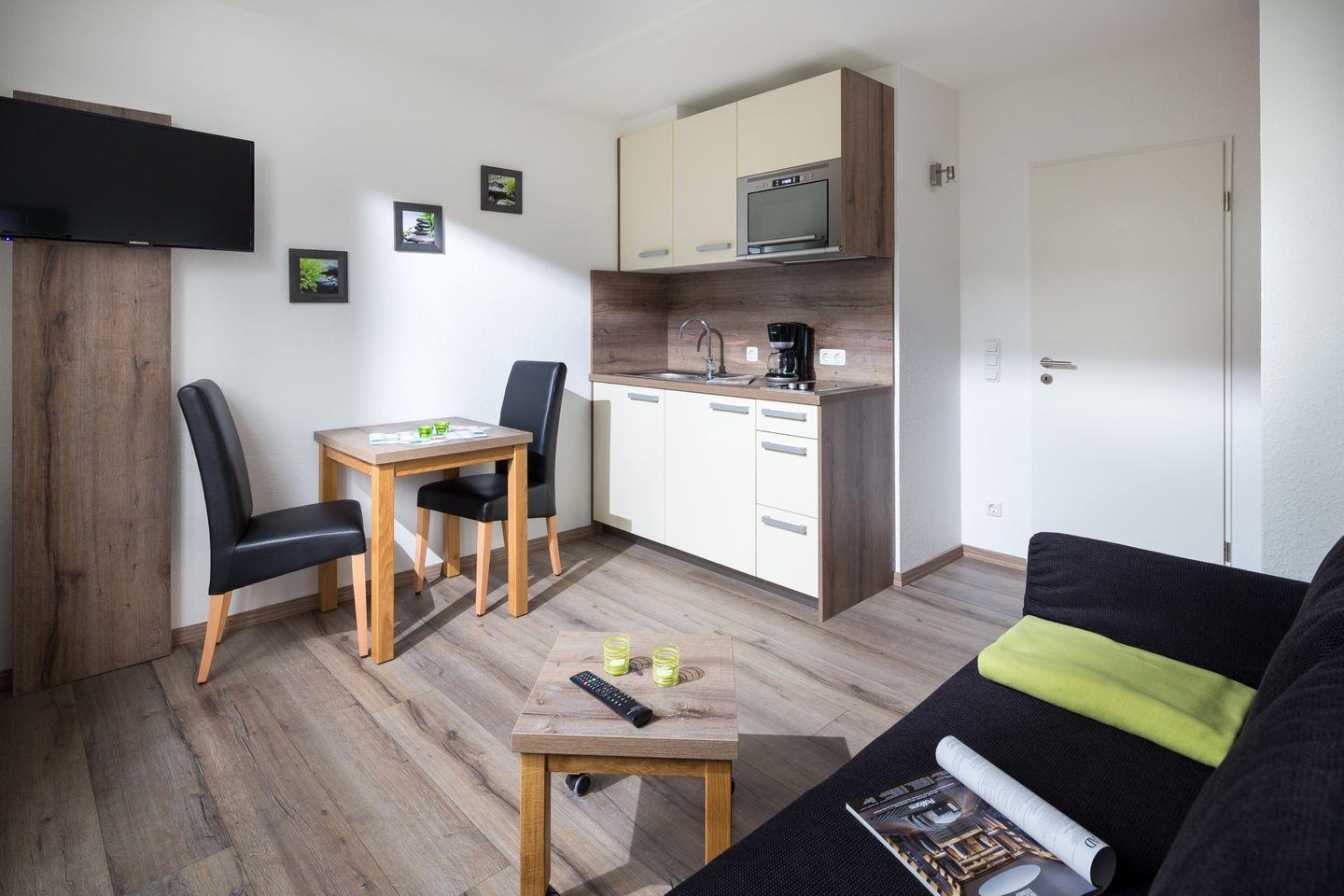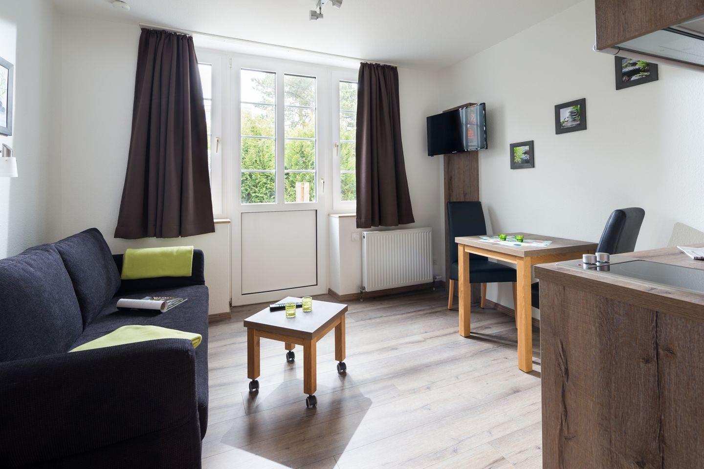 Das Appartement befindet sich im Erdgeschoss und ist rauchfrei, um Ihnen einen angenehmen Aufenthalt zu garantieren. Die durchdachte Raumaufteilung umfasst einen einladenden Wohnbereich mit einem gemütlichen Schlafsofa (160x200cm) und einem Esstisch, der Platz für entspannte Mahlzeiten bietet. Ein Kabel-TV sorgt dafür, dass Sie dabei auch die besten Unterhaltungsmöglichkeiten genießen können. Kostenfreies WLAN ist ebenfalls verfügbar, sodass Sie mit Ihren Lieben zu Hause in Kontakt bleiben oder die besten Aktivitäten der Umgebung recherchieren können.
