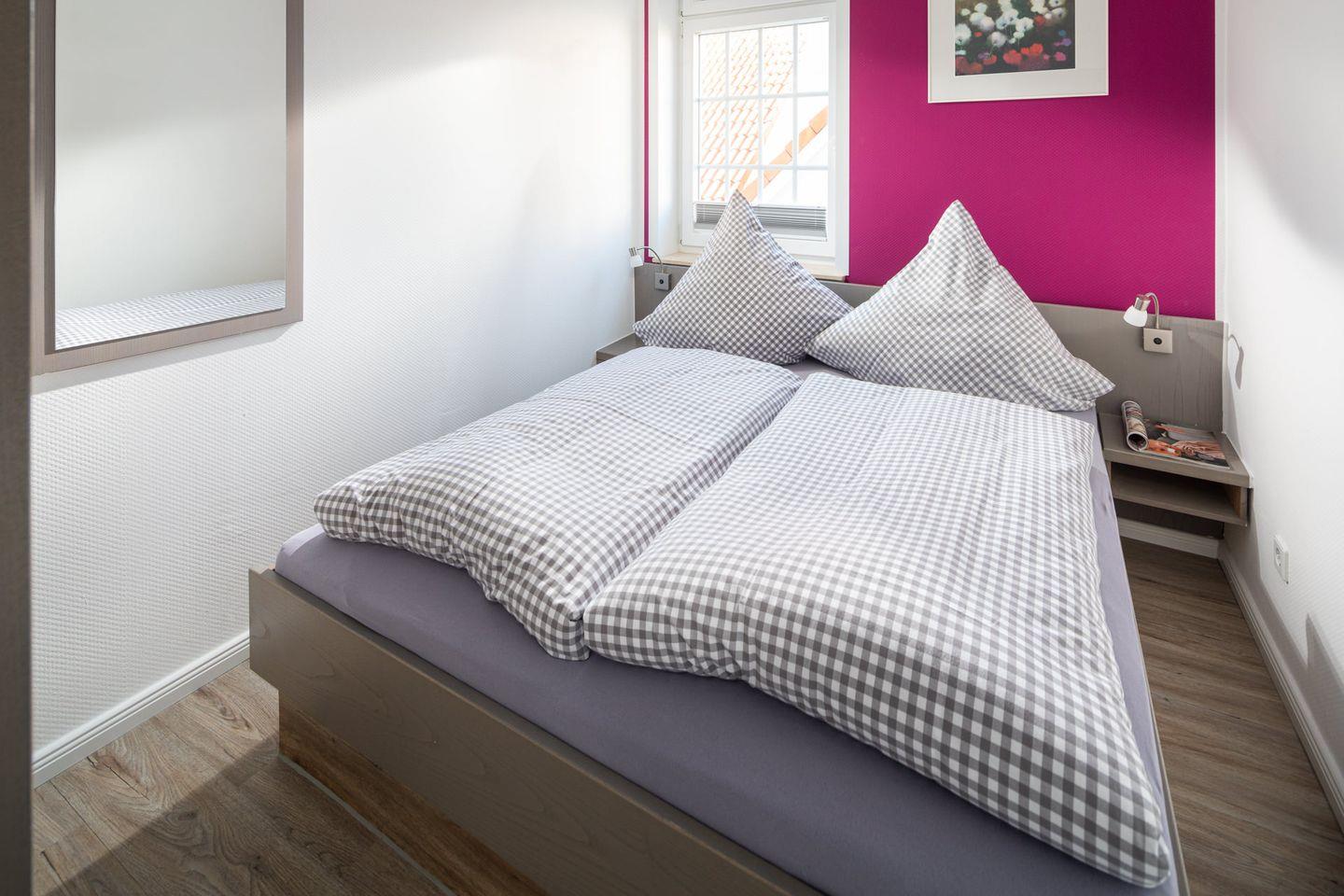 Die Ferienwohnung befindet sich im 1. Stock und verfügt über ein komfortables Schlafzimmer it einem Doppelbett (160x200cm) sowie einen hellen Wohnbereich mit einem gemütlichen Essbereich und einer offenen Küche. Die moderne Küche ist bestens ausgestattet und lässt keine Wünsche offen: Hier finden Sie alles, was Sie für die Zubereitung Ihrer Lieblingsgerichte benötigen – von Küchengeräten wie Kühlschrank, Gefrierfach, Ceranherd, Toaster, Wasserkocher bis hin zur Kaffeemaschine. Nach einer erfüllten Tagesgestaltung können Sie sich auf dem Sofa entspannen und Ihren Lieblingsfilm auf dem TV mit Kabelanschluss genießen.