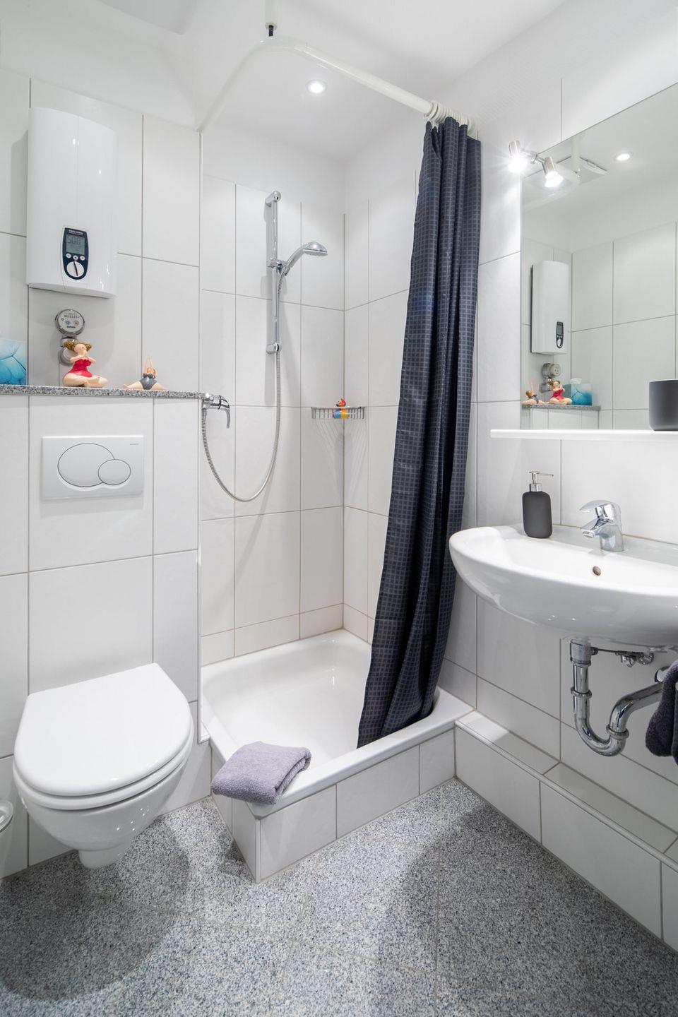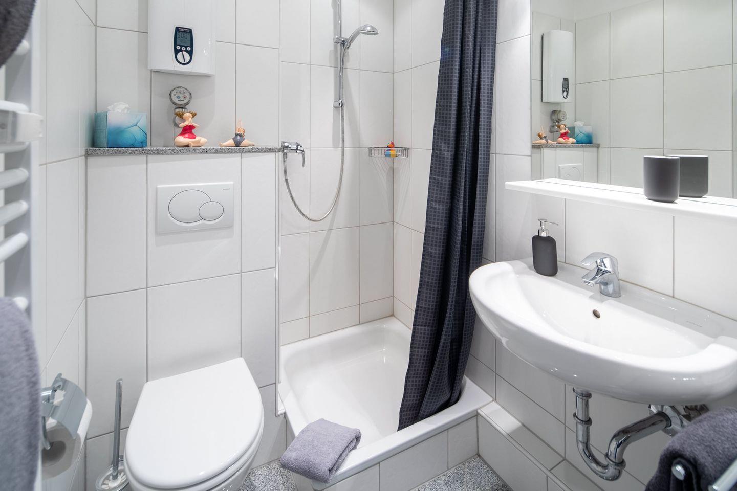 Das Badezimmer ist mit einer Dusche, einem Kosmetikspiegel und einem Haartrockner ausgestattet Außerdem stehen Ihnen Handtücher und Bettwäsche bereit, sodass Sie sich um nichts kümmern müssen und direkt in Ihren Urlaub starten können.