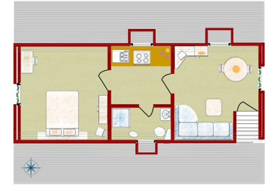 Die Wohnung bietet auf einem großzügigen Raum von 44 m² Platz für bis zu zwei Gäste und umfasst ein geschmackvoll eingerichtetes Schlafzimmer (Doppelbett 1,80 x 2,00m) sowie einen einladenden Wohnbereich. Hier können Sie nach einem erlebnisreichen Tag entspannen und die Ruhe genießen. Das Wohnzimmer ist mit einem komfortablen Sofa ausgestattet, ideal für gesellige Abende oder eine gemütliche TV-Nacht. Ein Flachbildfernseher mit Kabelanschluss sorgt für Unterhaltung. Falls Sie lieber ein Buch lesen möchten, lädt die Atmosphäre zum Verweilen ein.