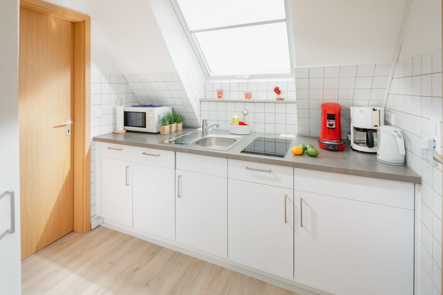 Die komplett ausgestattete Küche ermöglicht es Ihnen, Ihre Lieblingsgerichte zuzubereiten. Hier finden Sie alles, was Sie benötigen, einschließlich eines Herds, Kühlschranks, einer Mikrowelle sowie Geschirr und Besteck. Beginnen Sie Ihren Tag mit einem frisch gebrühten Kaffee aus der Espressomaschine oder der klassischen Kaffeemaschine und genießen Sie ihn am Esstisch beim Blick auf die einladende Wohnungseinrichtung.