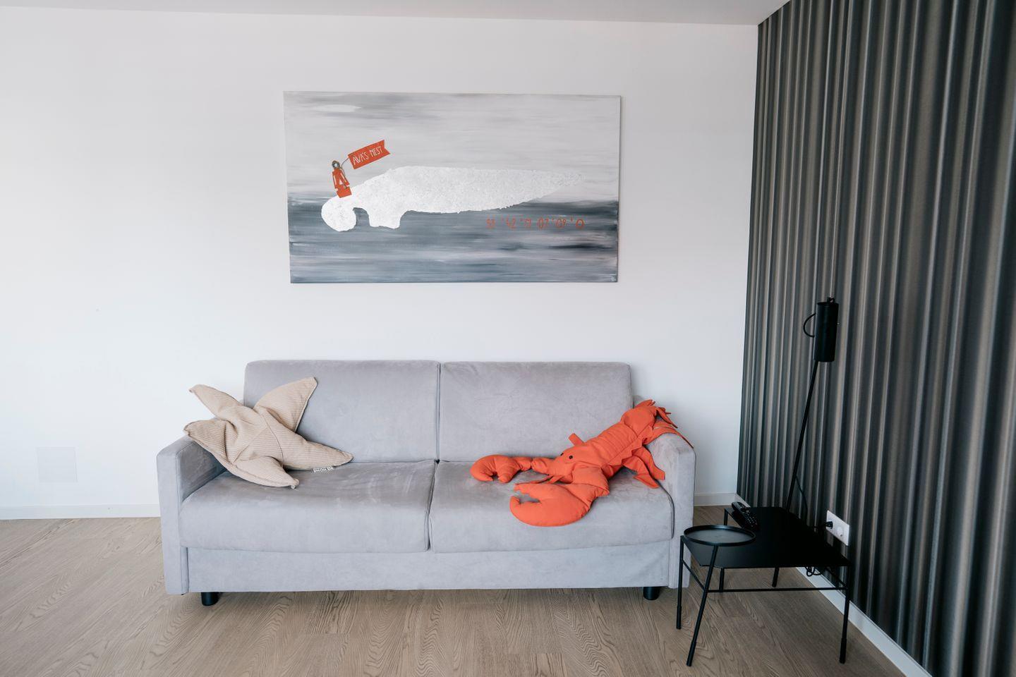 Das geräumige Wohnzimmer mit angrenzendem Koch- und Essbereich ist der Mittelpunkt dieser Komfort-Ferienwohnung. Hier finden Sie eine hochwertige Couch mit Schlaffunktion, ein Sessel, einen großen LED-Fernseher und den Zugang zum Balkon. Der Essbereich bietet ausreichend Platz für vier Personen.