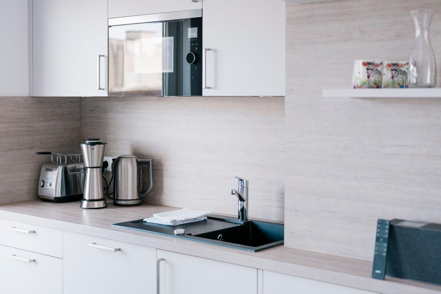 Die gut ausgestattete, moderne Küche bietet einen Kühlschrank, einen Backofen, eine Mikrowelle, eine Spülmaschine und ein Induktionskochfeld. Wasserkocher, zwei Kaffeemaschinen (Filter & Nespresso Kapseln) sowie ein Toaster sind ebenfalls vorhanden.