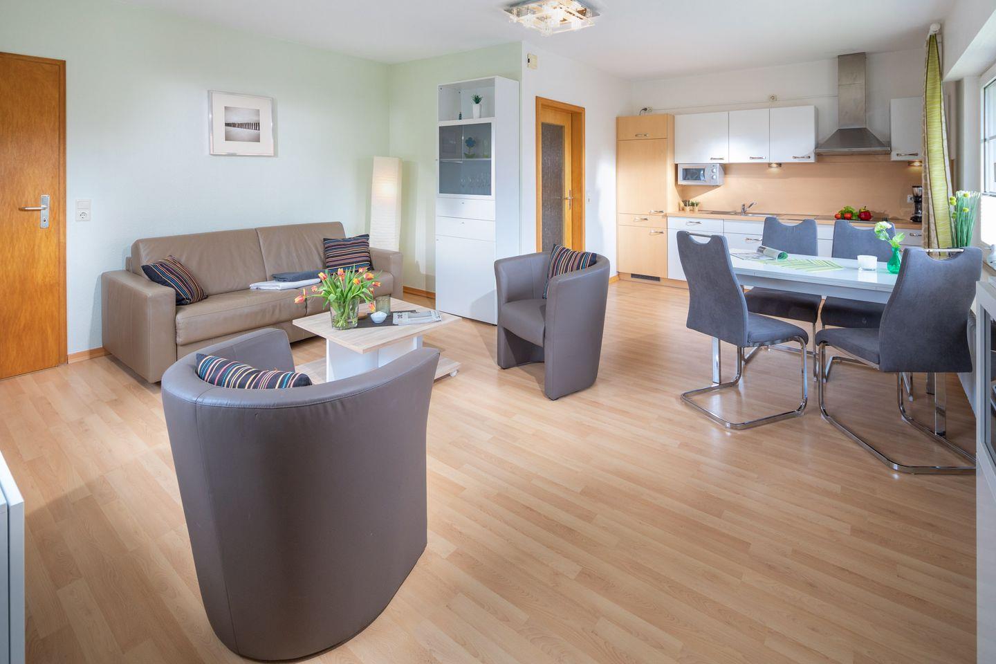 Die Ferienwohnung verfügt über ein helles und freundliches Schlafzimmer, das mit einem bequemen Bett ausgestattet ist. Ein Wohnzimmer mit einer behaglichen Sitzgruppe mit einem Schlafsofa und einem Esstisch lädt dazu ein, Zeit mit Ihren Liebsten zu verbringen und gemeinsame Mahlzeiten zu genießen. Der offene Küchenbereich ist mit allem ausgestattet, was Sie benötigen: von einem Herd über eine Spülmaschine bis hin zu einem Kühlschrank. Hier können Sie auch Ihre Lieblingsgerichte zubereiten und danach auf dem überdachten Balkon entspannen.