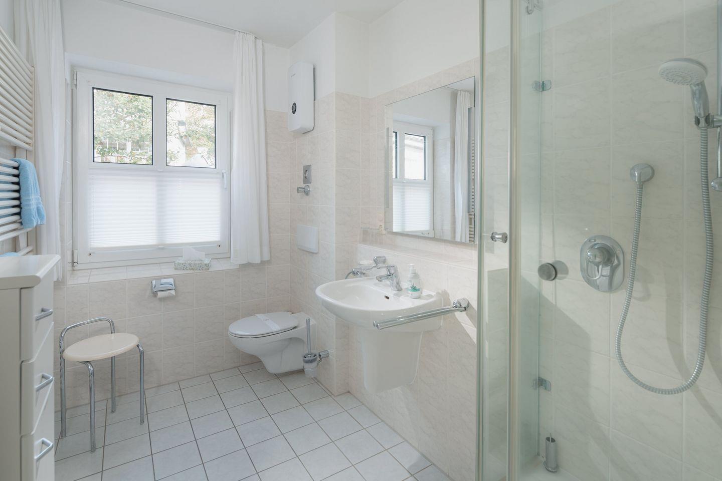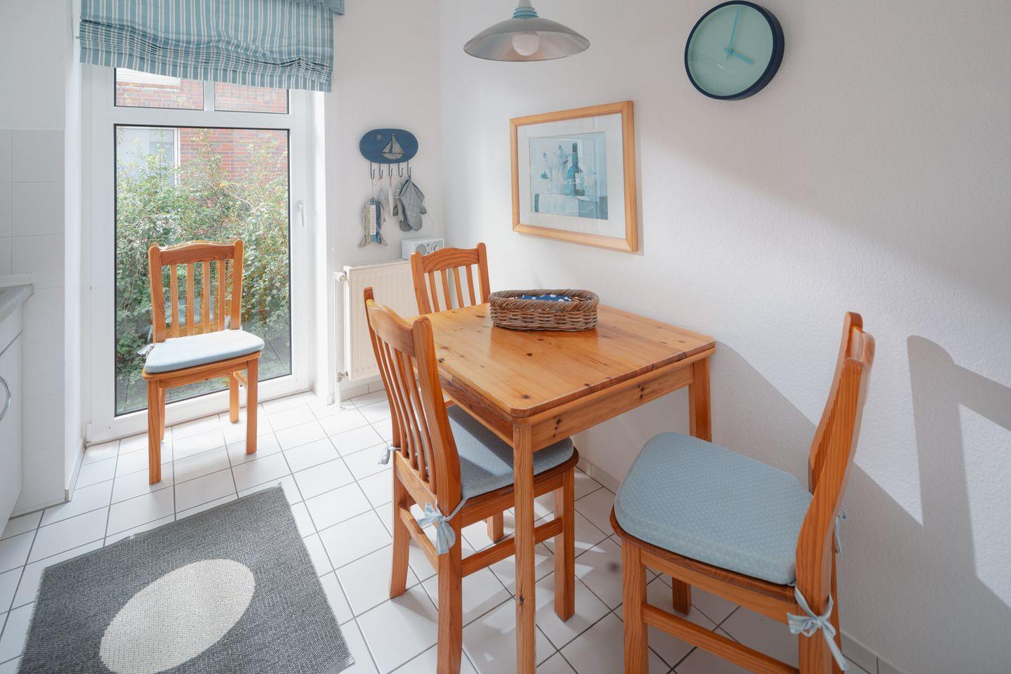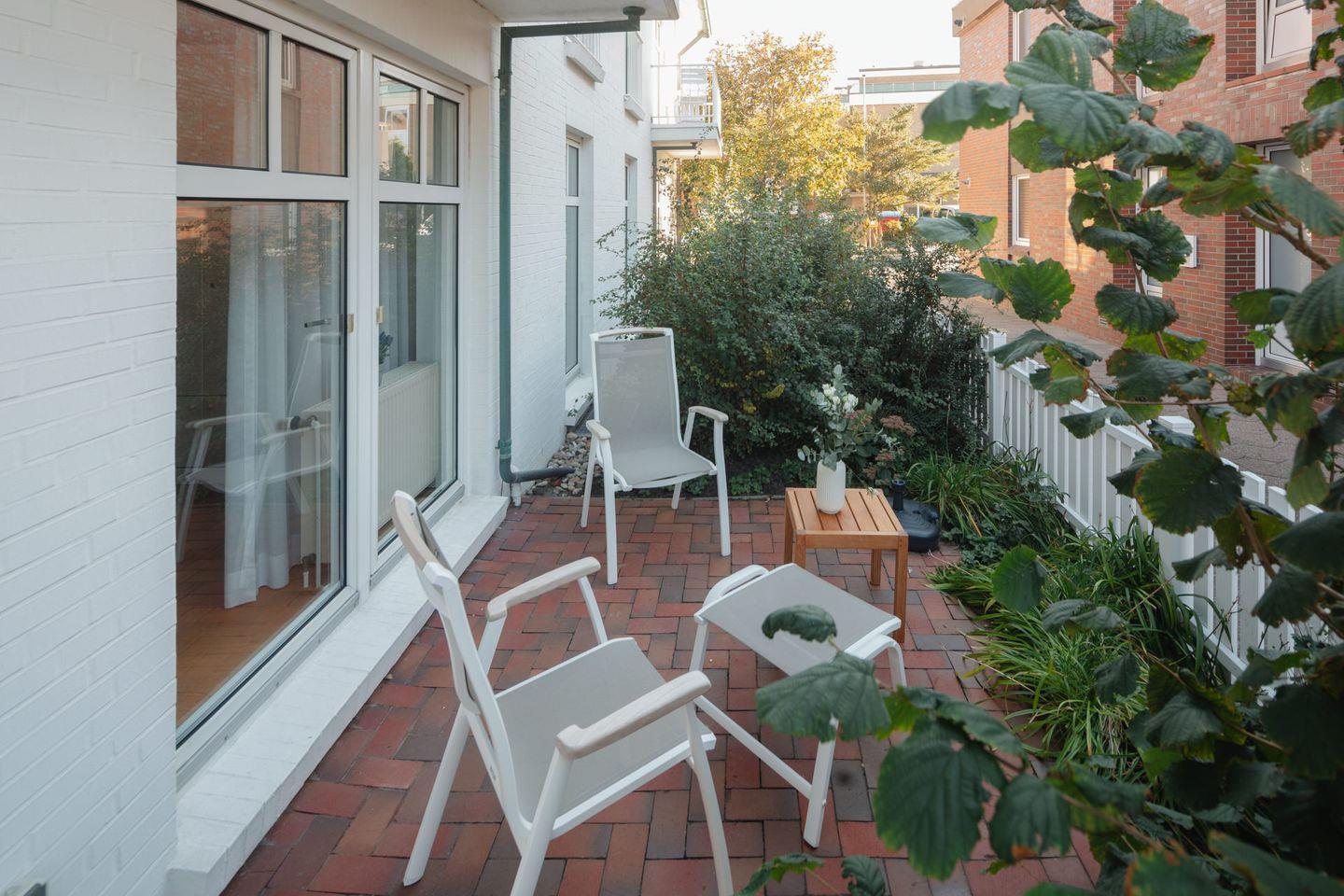 Die Wohnung ist ebenerdig erreichbar, lediglich zwei Stufen sind am Eingang vorhanden. Das Schlafzimmer ist mit einem Doppelbett (1,80m x 2,00m) ausgestattet. Die moderne separate Küchenzeile ist voll ausgestattet und hat einen Essbereich. Bei der Gestaltung des Wohnzimmers ist auf eine helle Einrichtung Wert gelegt worden. Das Badezimmer ist großzügig geschnitten und besitzt ein Außenfenster. Ein kleines Highlight der Wohnung ist die Terrasse (6qm). Waschmaschine und Wäschetrockner befinden sich im Keller und stehen (gegen Münzeinwurf) zur Verfügung, was besonders für längere Aufenthalte von Vorteil ist. Hunde sind in dieser Wohnung nicht erlaubt.