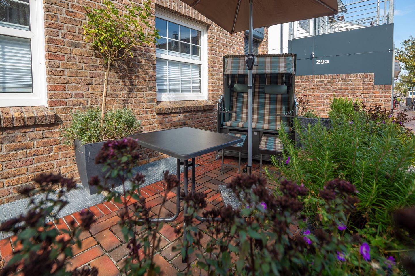 Die Ferienwohnung verfügt über eine kleine aber feine Terrasse vor dem Haus und lädt zum Gemütlichen verweilen nach einem Strandtag ein.