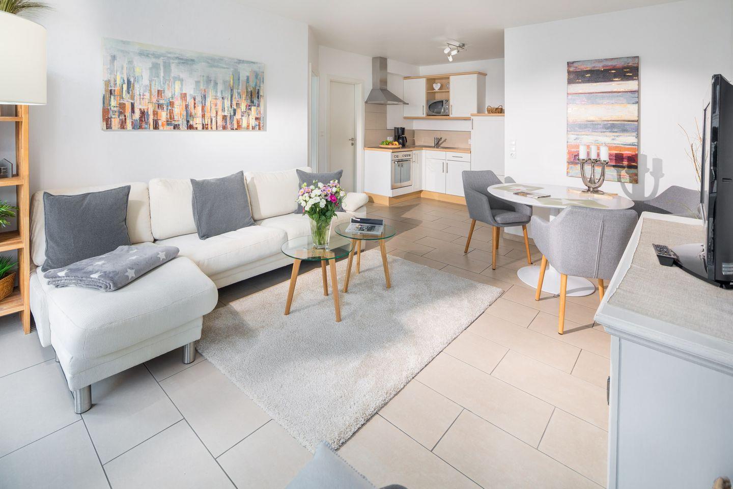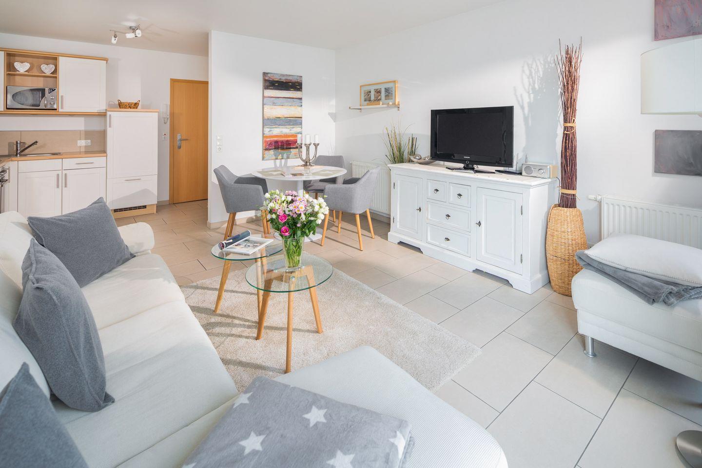 Der Balkon mit Sichtschutz bietet Ihnen die Möglichkeit, die frische Nordseeluft und die Sonne zu genießen – der perfekte Ort für Ihre Frühstücks-Cappuccinos oder romantische Abendstunden. Mit einem Fernseher im Wohnzimmer und einem weiteren im Schlafzimmer können Sie sich nach einem erlebnisreichen Tag entspannen, während das WLAN im gesamten Appartement Ihnen Zugang zum Internet bietet.