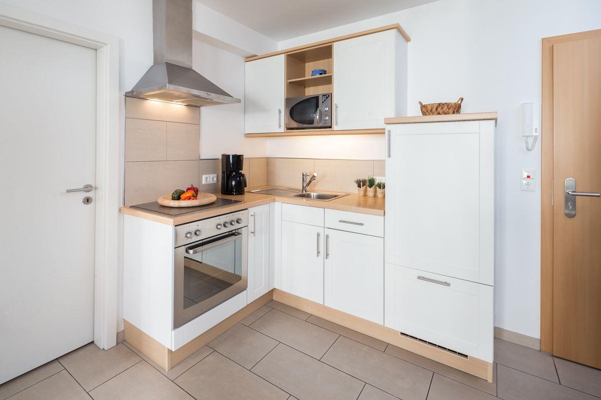 Mit einem großzügigen Schlafzimmer und einem gemütlichen Wohnzimmer, das eine offene Küche integriert, finden Sie hier alles, was das Herz begehrt. Die Küche ist voll ausgestattet mit einem Herd, Mikrowelle, Backofen und Kühlschrank, sodass Sie auch während Ihres Urlaubs das Gefühl haben, zu Hause zu sein. Ein Esstisch lädt zu gemeinsamen Mahlzeiten ein – genießen Sie Ihre Kochkünste oder probieren Sie lokale Köstlichkeiten in einem der nahegelegenen Restaurants, die nur 100 Meter entfernt sind.