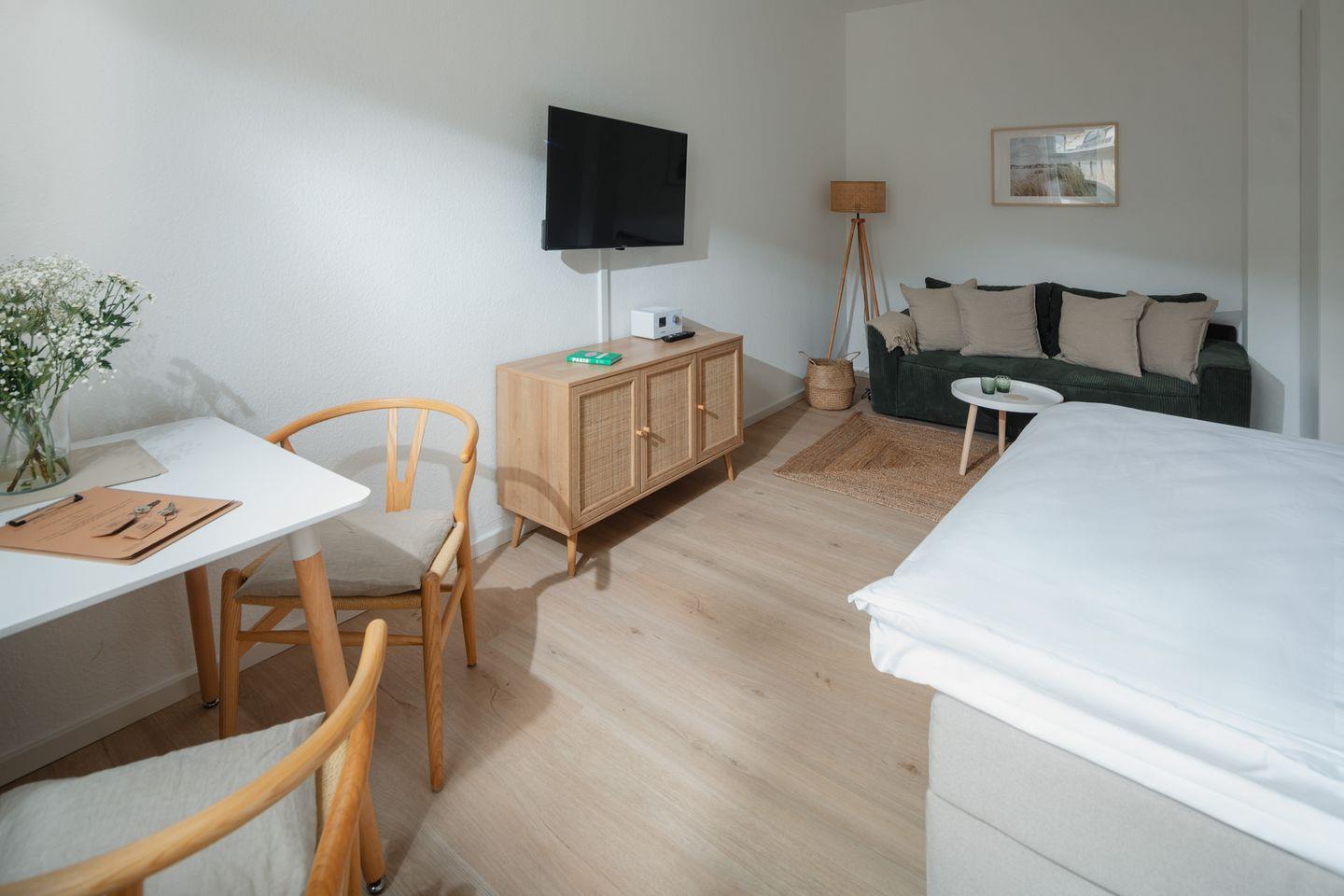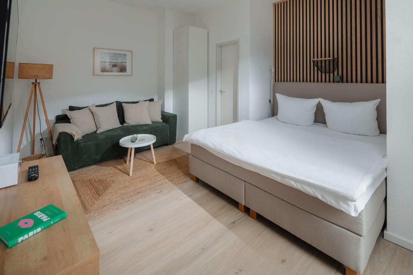 Das Apartment ist komplett ausgestattet und bietet alles, was Sie für einen angenehmen Aufenthalt benötigen. Für einen traumhaften Schlaf sorgt das Boxspringbett der Größe 180x200cm.