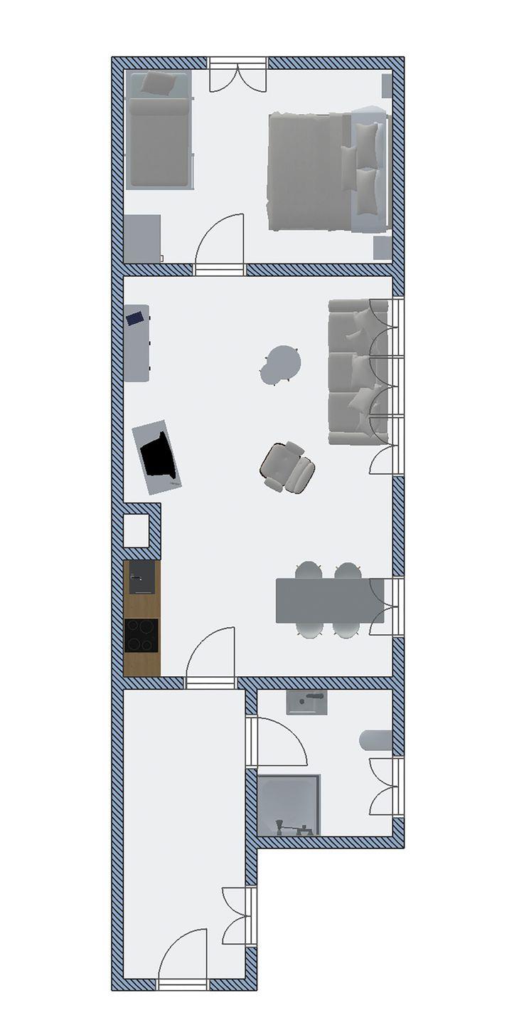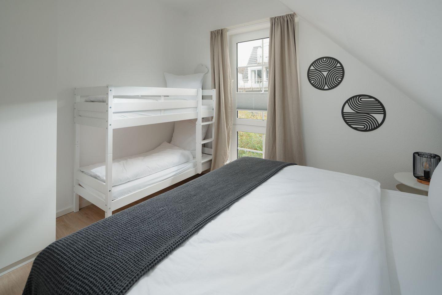 Die Wohnung ist komplett ausgestattet und bietet alles, was Sie für einen angenehmen Aufenthalt benötigen. Das Schlafzimmer verfügt über ein komfortables Boxspringbett der Größe 180x200cm sowie eine Hochbett der Größe von 70x160 cm (nur für Kinder geeignet!)