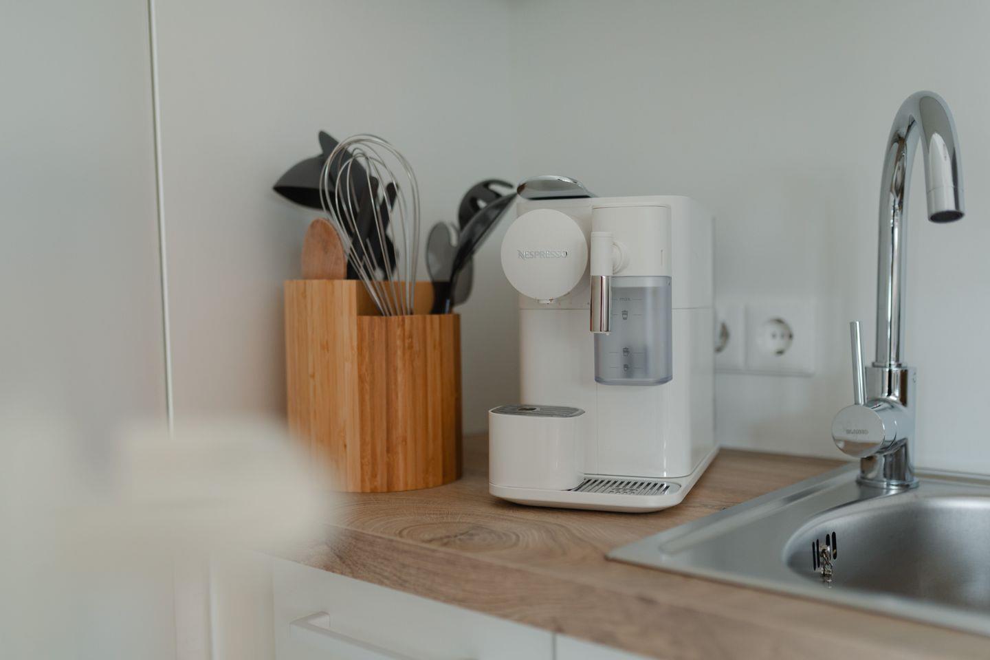 Das Tageslichtbad ist mit einem Waschbecken, einem WC sowie einer Dusche ausgestattet. Im gemütlichen Wohnzimmer mit offener Küche erwartet Sie ein Schlafsofa der Größe 160x200cm, welches auch als Schlafmöglichkeit dienen kann. Die Küche ist umfassend ausgestattet mit Kühlschrank, Gefrierfach, Backofen, Ceranfeld, Spülmaschine, Kaffeemaschine und einer Nespresso-Kapselmaschine. Bei Bedarf stellen wir Ihnen gerne eine Mikrowelle zur Verfügung.
