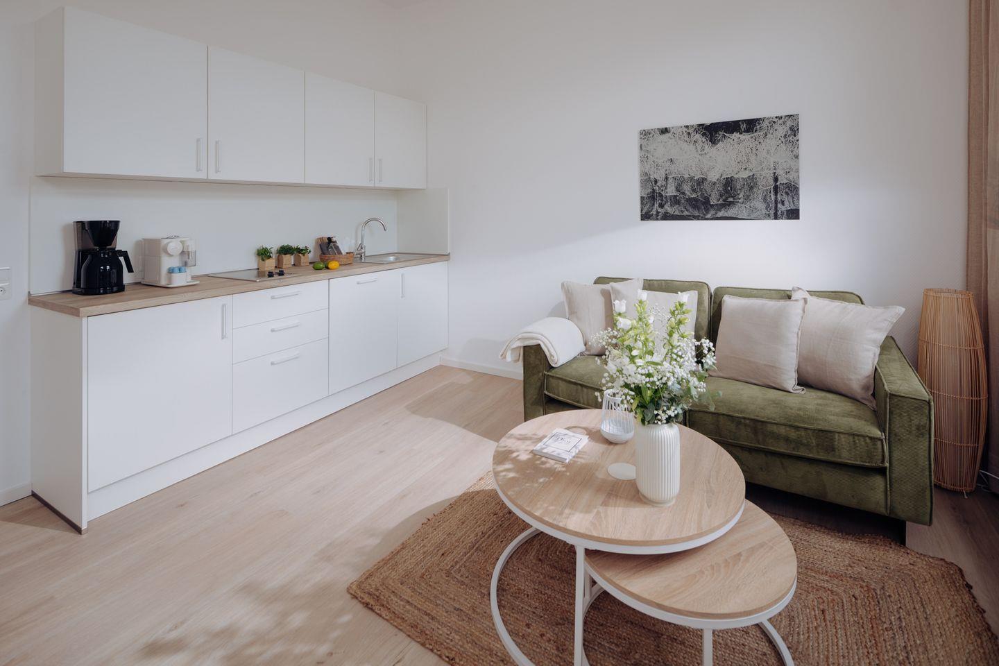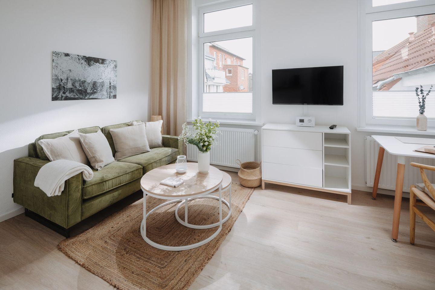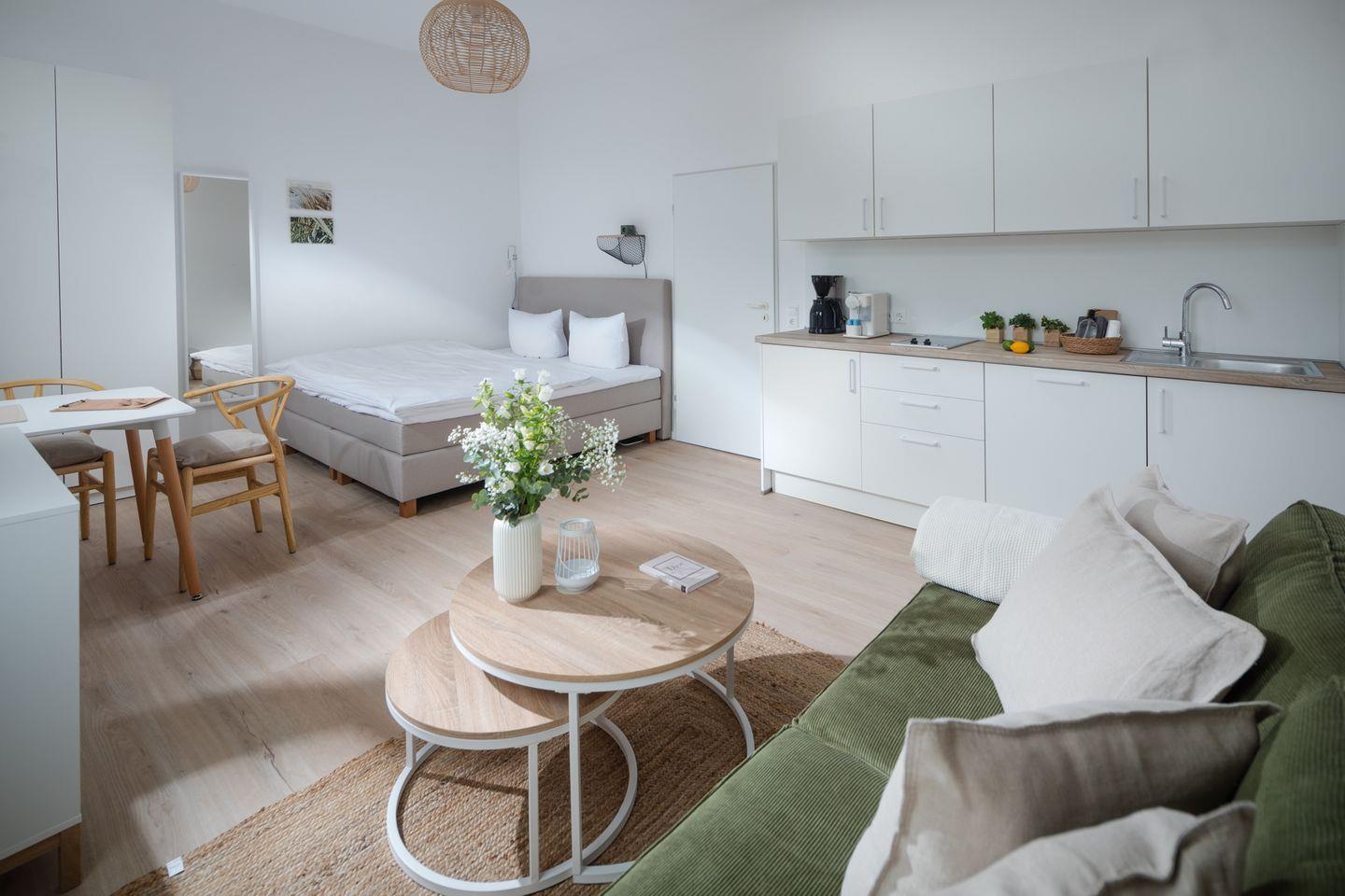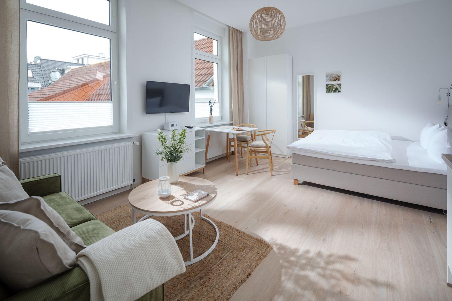 Herzlich willkommen im Apartment B05 im frisch renovierten Haus Bismarck 1884! Dieses gemütliche Einzimmer-Apartment verbindet modernen Komfort mit dem charmanten skandinavischen Stil. Die frisch gestalteten Räumlichkeiten bieten eine einladende Atmosphäre für einen angenehmen Aufenthalt.