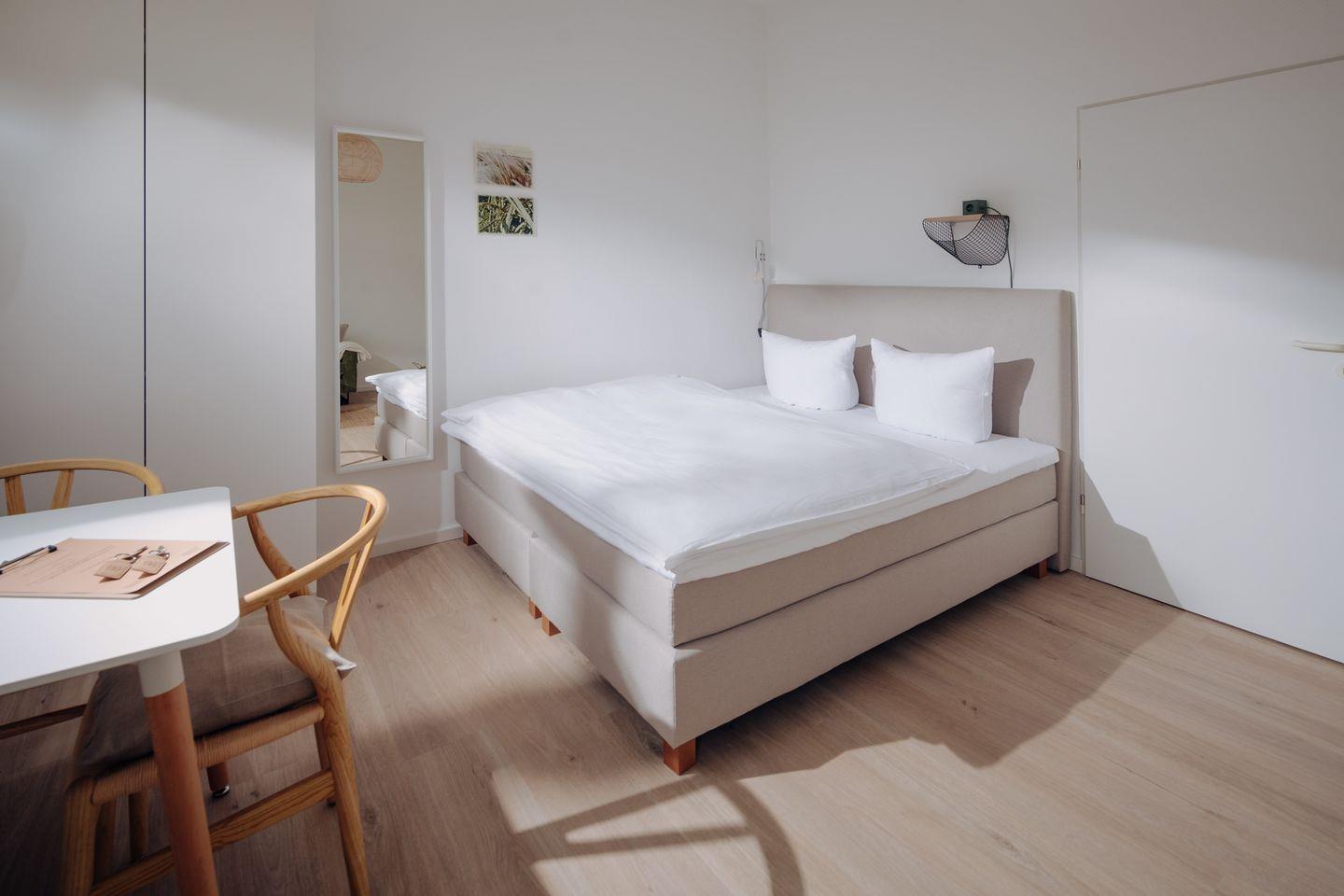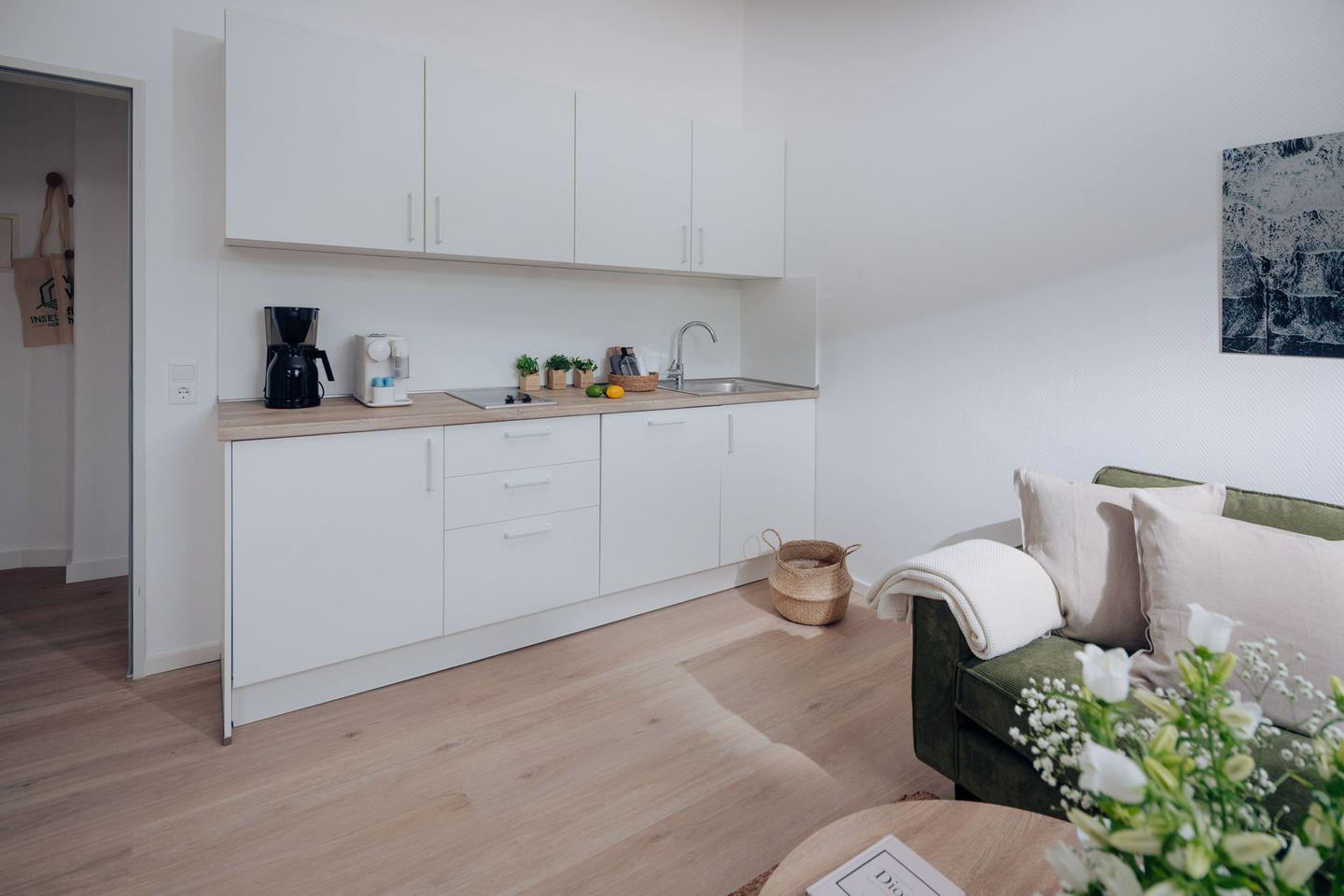 Die neue Küche ist komplett ausgestattet und lädt dazu ein, leckere Mahlzeiten zuzubereiten. Hier finden Sie moderne Geräte und alles, was Sie für die Zubereitung Ihrer Lieblingsspeisen benötigen. Die neuen Möbel setzen Akzente im skandinavischen Design und schaffen eine Wohlfühlatmosphäre. Für einen traumhaften Schlaf sorgt das Boxspringbett der Größe 180x200cm.
