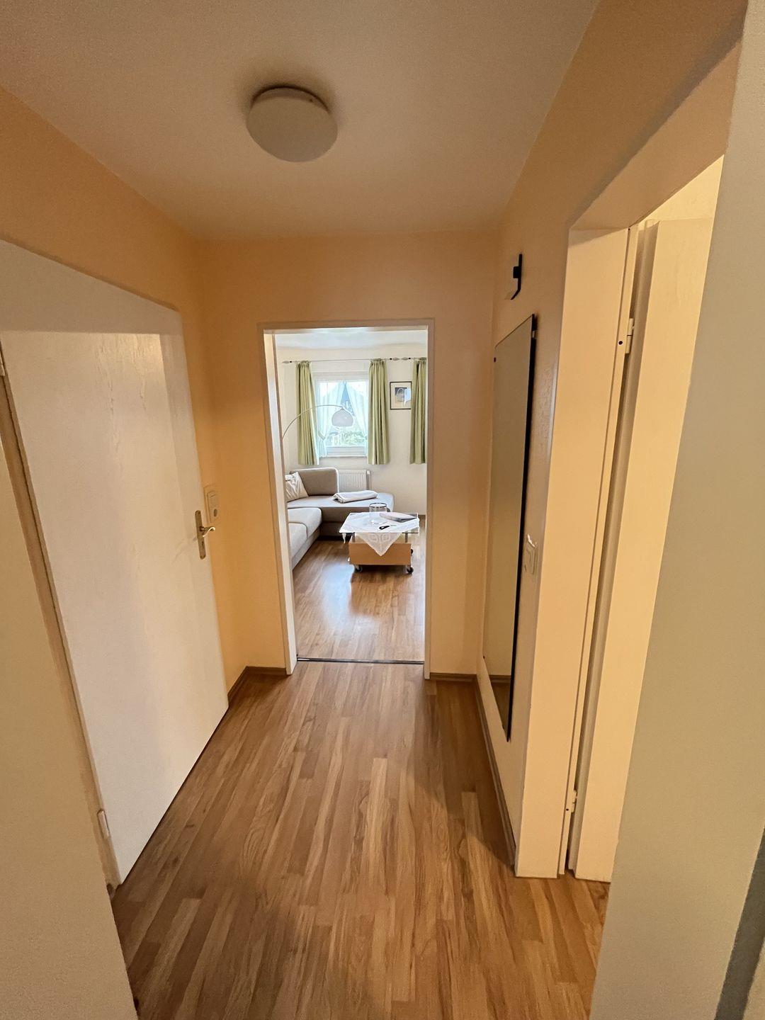Die Wohnung ist modern, sehr gemütlich und zeitlos eingerichtet, verfügt über einen warmen Fußbodenbelag und eine helle Fensterfront mit Blick aufs "Grün".