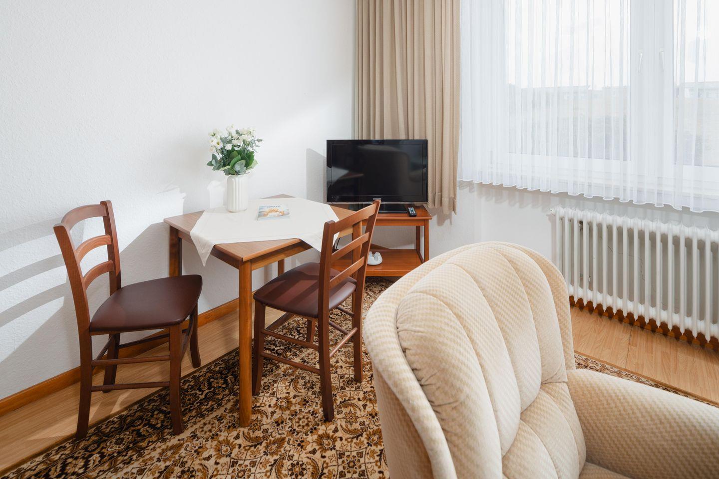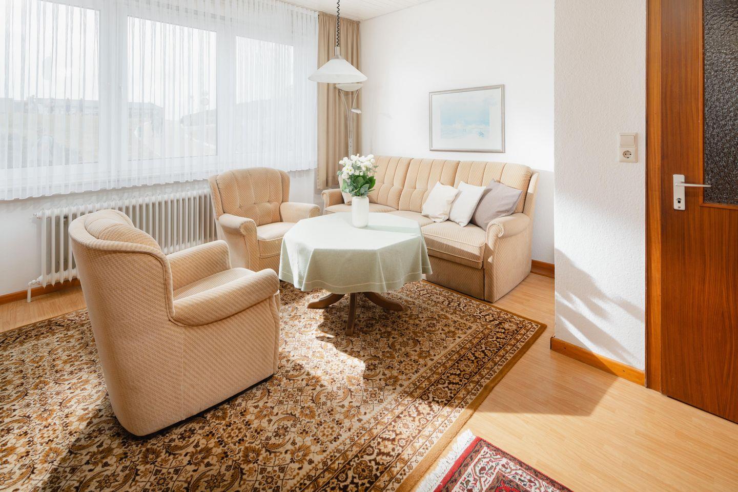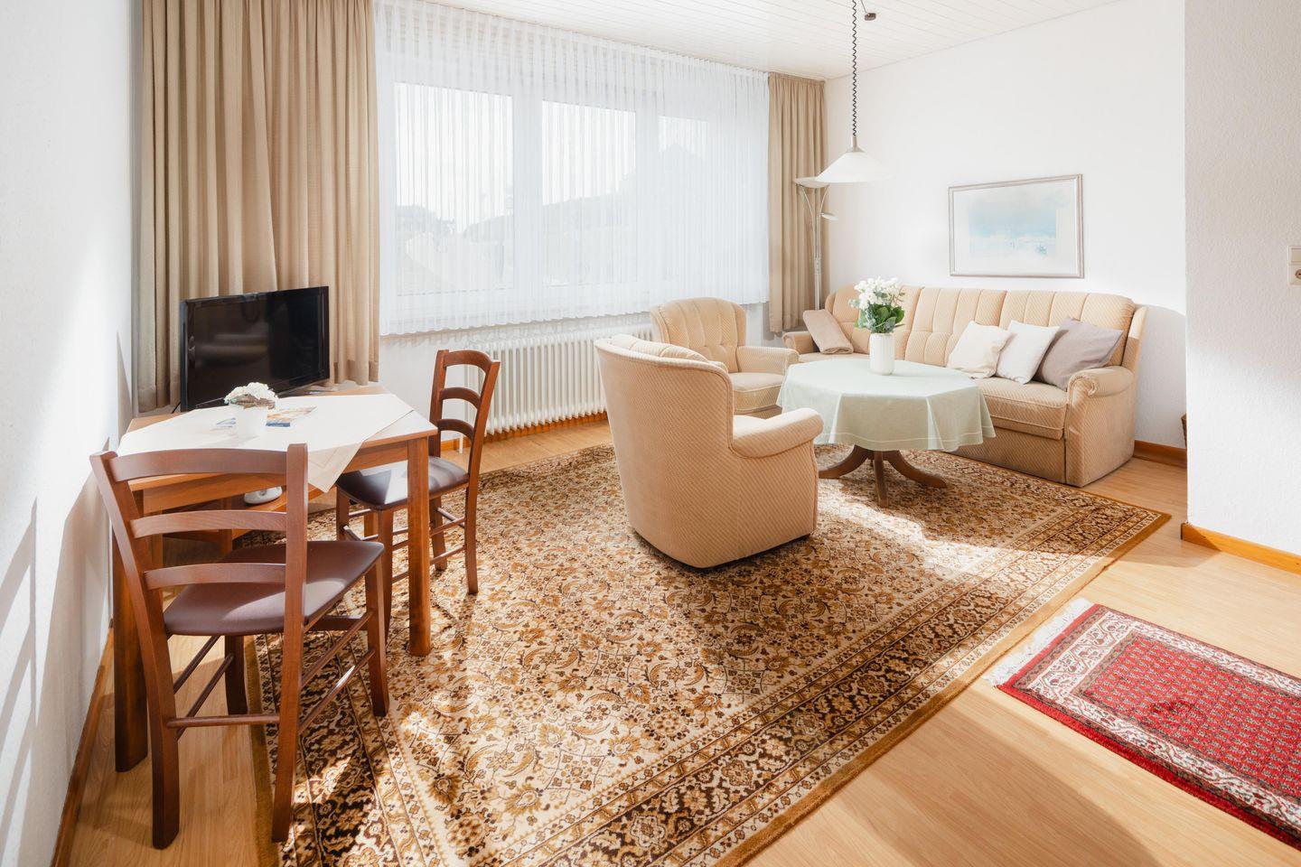 Das Haus Meeresblick, Damenpfad 24 liegt zentral und in unmittelbarer Nähe der Strandpromenade und der Strandkorbwiese. Die Wohnung 1 liegt im Erdgeschoß. Das Kur - und Einkaufszentrum, das BADEHAUS und die Fußgängerzone sind in wenigen Minuten zu Fuß zu erreichen. Das Haus hat 7 Wohnungen und ist ganzjährig geöffnet. Viel Holz wurde verwendet, um eine wohnliche Atmosphäre zu schaffen. Die Treppen sind mit Läufern ausgelegt, so dass unbedingte Ruhe gegeben ist. Zur kompletten Ausstattung aller Wohnungen gehören Kabel-TV. Tiere können nicht mitgebracht werden