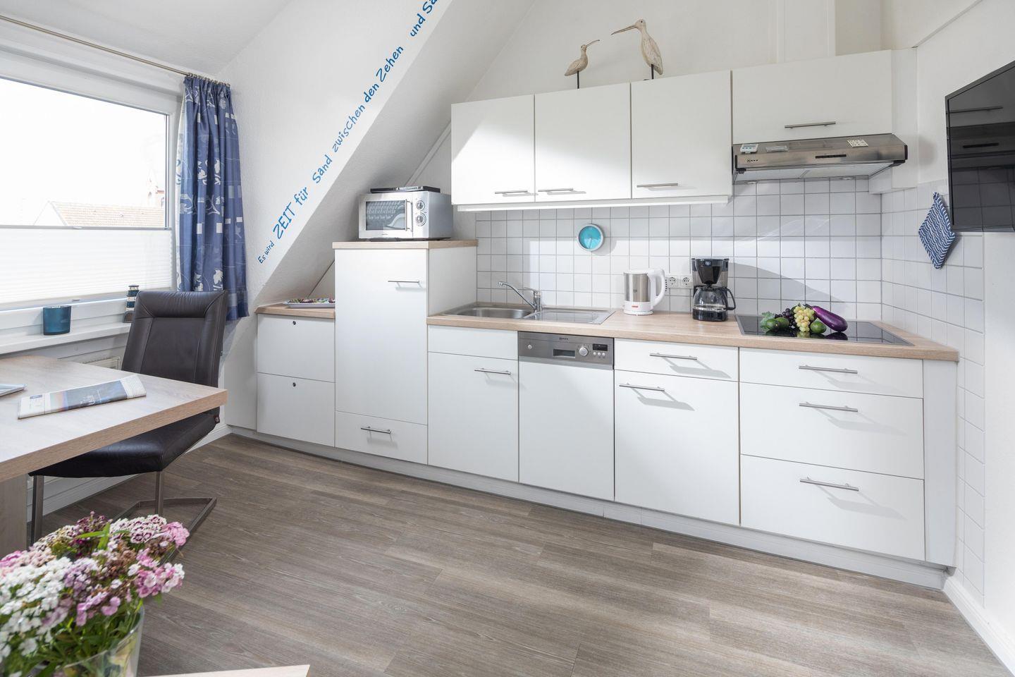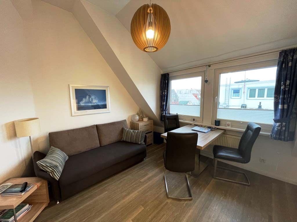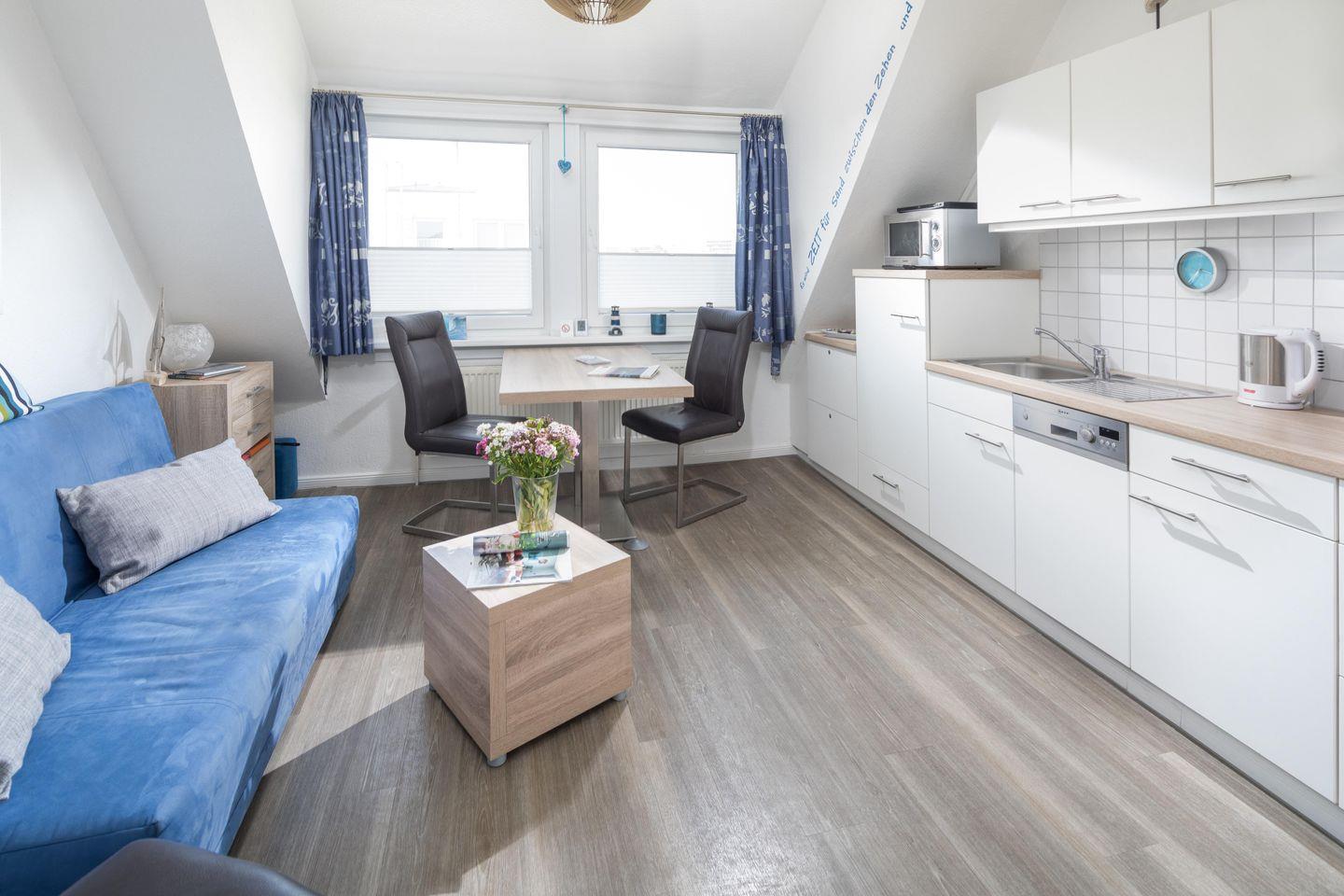 Diese helle und gut geschnittene 2-Zimmer-Ferienwohnung liegt in einer wunderschönen Jugendstil-Villa im Zentrum von Norderney. Kurplatz und Badehaus, Supermarkt, Bäcker sowie Restaurants liegen direkt um die Ecke. Und bis zum Strand sind es gerade einmal 300 Meter. Die Wohnung liegt im 2. Stock der liebevoll restaurierten Villa – das ist das Dachgeschoss, so dass Sie über sich nur noch das gut gedämmte Dach und die Möwen haben. Früher konnte man vom Schlafzimmer aus ein kleines Stück Nordsee sehen - daher heißt diese Wohnung "Seeblick". Mittlerweile ist diese Lücke zugebaut worden. Aber von allen Fenstern aus haben Sie einen traumhaften Blick über die Dächer der Innenstadt. Die gesamte Wohnung wurde im Frühsommer 2016 komplett hochwertig neu eingerichtet, es gab neue Böden und einen frischen Anstrich. So erwartet Sie ein schicker und moderner Wohnstandard. Dazu kommen die bis zu 3,60 m hohen Räume und die gemütlichen Dachschrägen – hier werden Sie sich bestimmt sofort wohl fühlen! Die Küchenzeile ist im Wohnraum integriert und mit Geschirrspüler, Ceran Kochfeld, Dunstabzugshaube, Toaster, Kaffeemaschine und Wasserkocher sehr gut bestückt. Eine Mikrowelle mit Grillfunktion steht ebenfalls zur Verfügung. Im Schlafzimmer finden Sie ein großes Doppelbett und den geräumigen Kleiderschrank. Im gemütlichen Wohnzimmer lässt sich die Couch zu einem bequemen 1,60 m breiten Bett umwandeln. Der Esstisch bietet bequem Platz für 4 Personen. Das moderne Bad hat viele Ablagemöglichkeiten und eine große Dusche. Der großzügige Flur bietet Platz für viele Schuhe und Jacken. Ein Kabel-TV und eine kleine CD-Anlage sind vorhanden. WLan ist für unsere Gäste natürlich kostenlos verfügbar. Viele kleine Extras sorgen dafür, dass unsere Gäste sich wie zuhause fühlen und gerne wieder kommen. So gibt es z.B. diverse DVDs und CDs für unsere Gäste – falls das Wetter mal den berühmten „Norderneyer Seenebel“ bringt. Im Haus befinden sich eine Waschmaschine und ein Trockner, die gegen Gebühr genutzt werden können. Eine kleine Bücherecke in der Diele des Hauses hilft aus, wenn die eigene Urlaubslektüre ausgelesen ist. Viele Stammkunden buchen von Jahr zu Jahr direkt wieder - das spricht für die gute Ausstattung und Pflege der Wohnung. Die traumhafte Lage, ruhig und doch sehr zentral, wird Sie begeistern! Haustiere bitte auf Anfrage. Die Wohnung ist nach DTV-Klassifizierung bewertet und mit 3 Sternen ausgezeichnet.