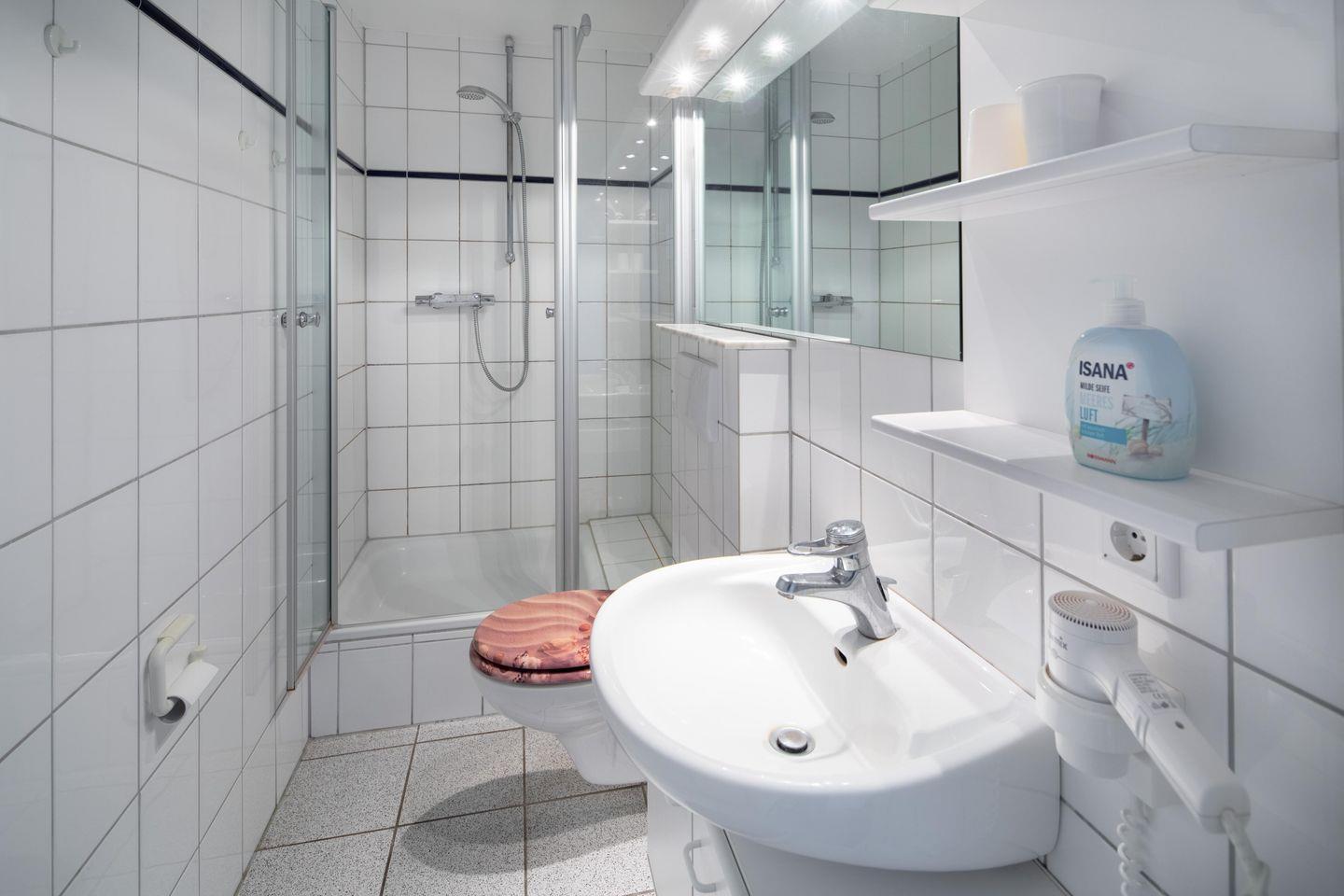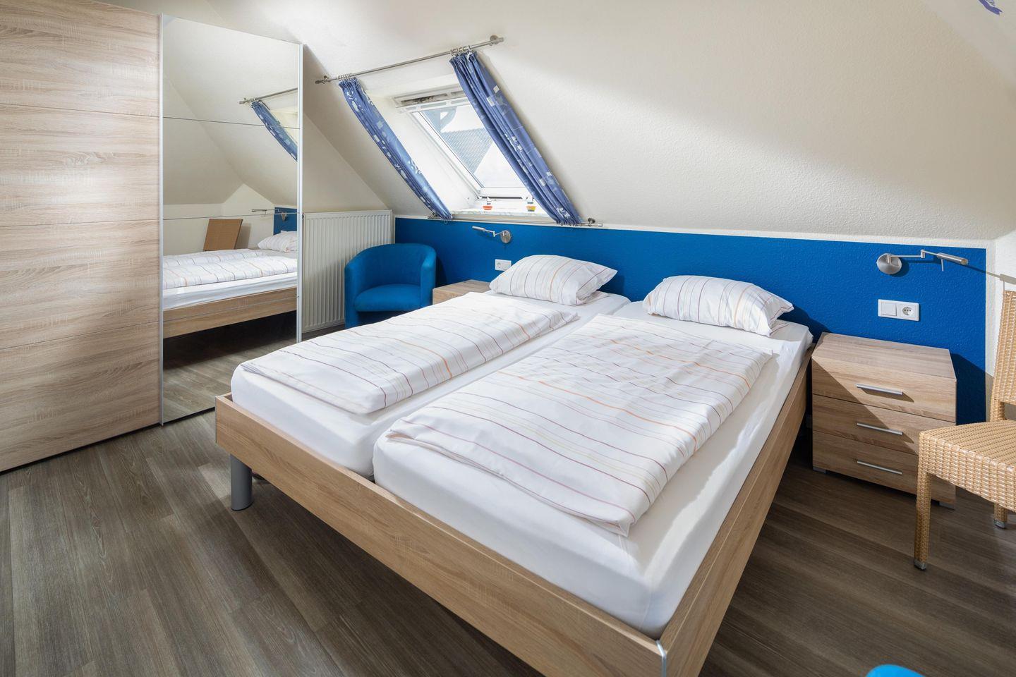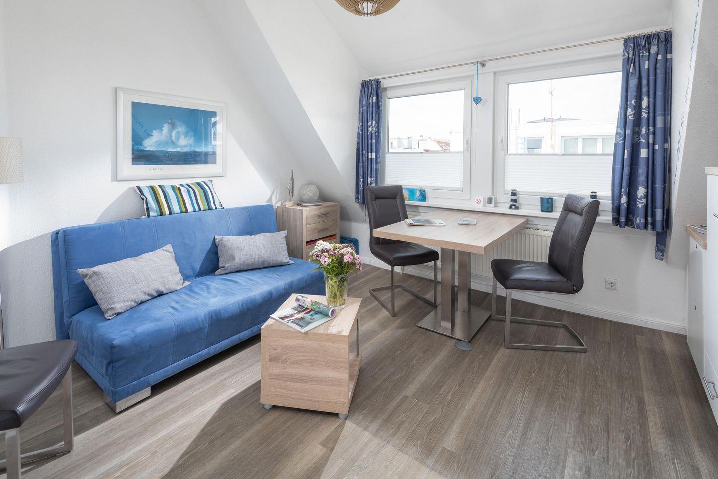 Diese helle und gut geschnittene 2-Zimmer-Ferienwohnung liegt in einer wunderschönen Jugendstil-Villa im Zentrum von Norderney. Kurplatz und Badehaus, Supermarkt, Bäcker sowie Restaurants liegen direkt um die Ecke. Und bis zum Strand sind es gerade einmal 300 Meter. Die Wohnung liegt im 2. Stock der liebevoll restaurierten Villa – das ist das Dachgeschoss, so dass Sie über sich nur noch das gut gedämmte Dach und die Möwen haben. Früher konnte man vom Schlafzimmer aus ein kleines Stück Nordsee sehen - daher heißt diese Wohnung "Seeblick". Mittlerweile ist diese Lücke zugebaut worden. Aber von allen Fenstern aus haben Sie einen traumhaften Blick über die Dächer der Innenstadt. Die gesamte Wohnung wurde im Frühsommer 2016 komplett hochwertig neu eingerichtet, es gab neue Böden und einen frischen Anstrich. So erwartet Sie ein schicker und moderner Wohnstandard. Dazu kommen die bis zu 3,60 m hohen Räume und die gemütlichen Dachschrägen – hier werden Sie sich bestimmt sofort wohl fühlen! Die Küchenzeile ist im Wohnraum integriert und mit Geschirrspüler, Ceran Kochfeld, Dunstabzugshaube, Toaster, Kaffeemaschine und Wasserkocher sehr gut bestückt. Eine Mikrowelle mit Grillfunktion steht ebenfalls zur Verfügung. Im Schlafzimmer finden Sie ein großes Doppelbett und den geräumigen Kleiderschrank. Im gemütlichen Wohnzimmer lässt sich die Couch zu einem bequemen 1,60 m breiten Bett umwandeln. Der Esstisch bietet bequem Platz für 4 Personen. Das moderne Bad hat viele Ablagemöglichkeiten und eine große Dusche. Der großzügige Flur bietet Platz für viele Schuhe und Jacken. Ein Kabel-TV und eine kleine CD-Anlage sind vorhanden. WLan ist für unsere Gäste natürlich kostenlos verfügbar. Viele kleine Extras sorgen dafür, dass unsere Gäste sich wie zuhause fühlen und gerne wieder kommen. So gibt es z.B. diverse DVDs und CDs für unsere Gäste – falls das Wetter mal den berühmten „Norderneyer Seenebel“ bringt. Im Haus befinden sich eine Waschmaschine und ein Trockner, die gegen Gebühr genutzt werden können. Eine kleine Bücherecke in der Diele des Hauses hilft aus, wenn die eigene Urlaubslektüre ausgelesen ist. Viele Stammkunden buchen von Jahr zu Jahr direkt wieder - das spricht für die gute Ausstattung und Pflege der Wohnung. Die traumhafte Lage, ruhig und doch sehr zentral, wird Sie begeistern! Haustiere bitte auf Anfrage. Die Wohnung ist nach DTV-Klassifizierung bewertet und mit 3 Sternen ausgezeichnet.