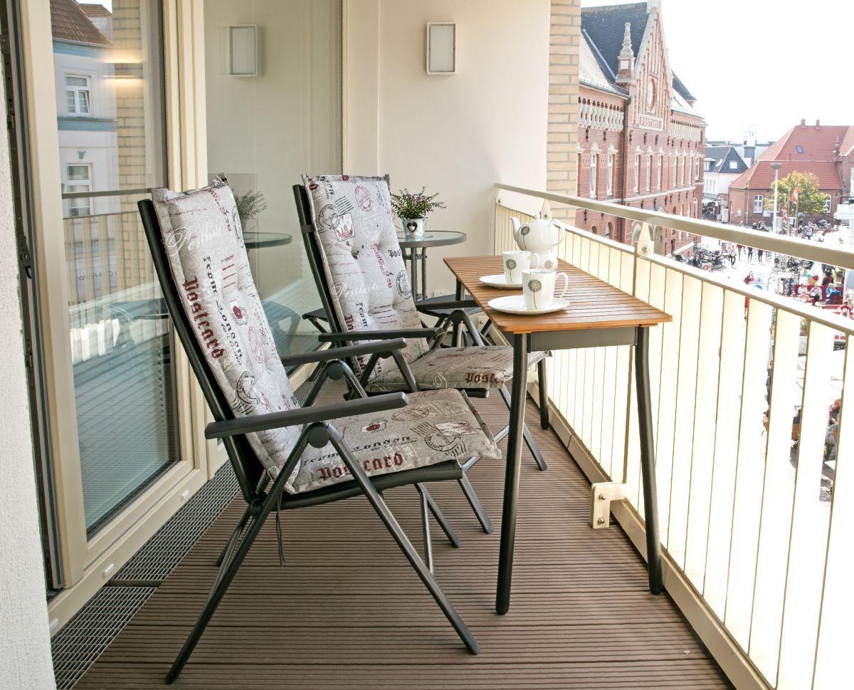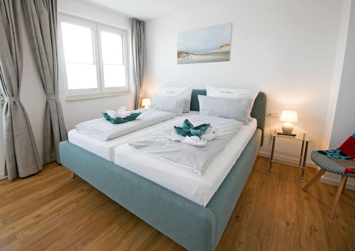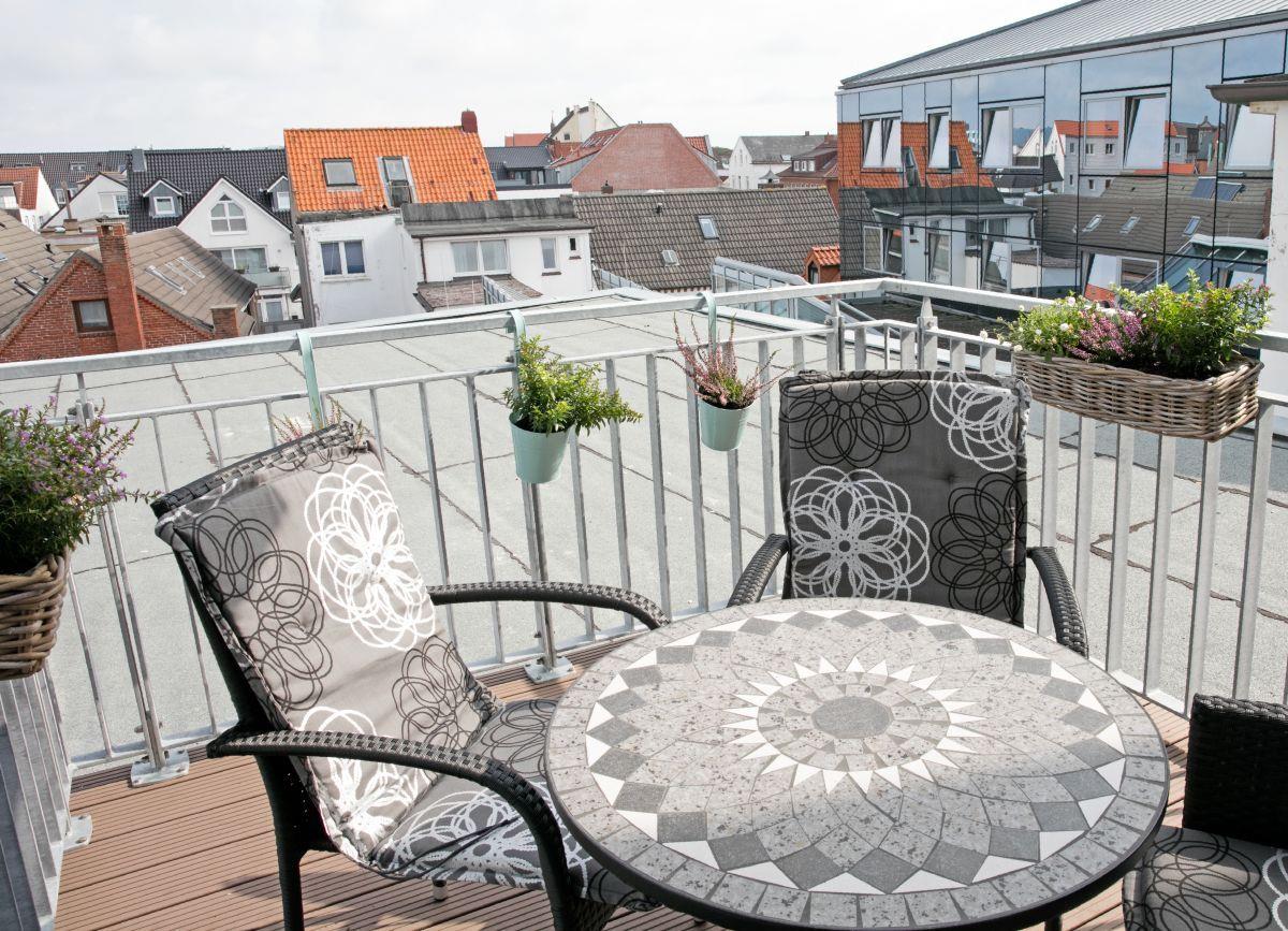 Blick auf die Fußgängerzone und die Silhouette von Norderney. Das Haus verfügt