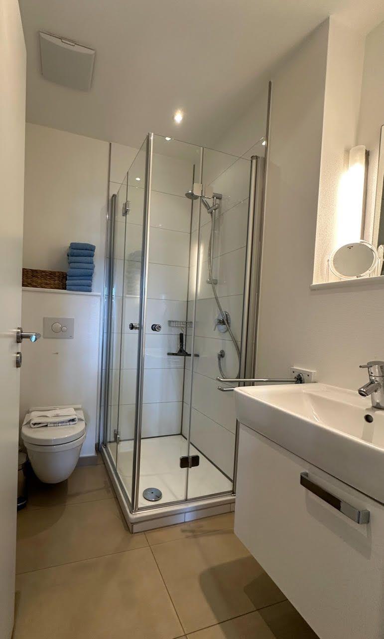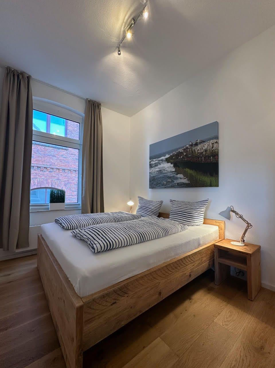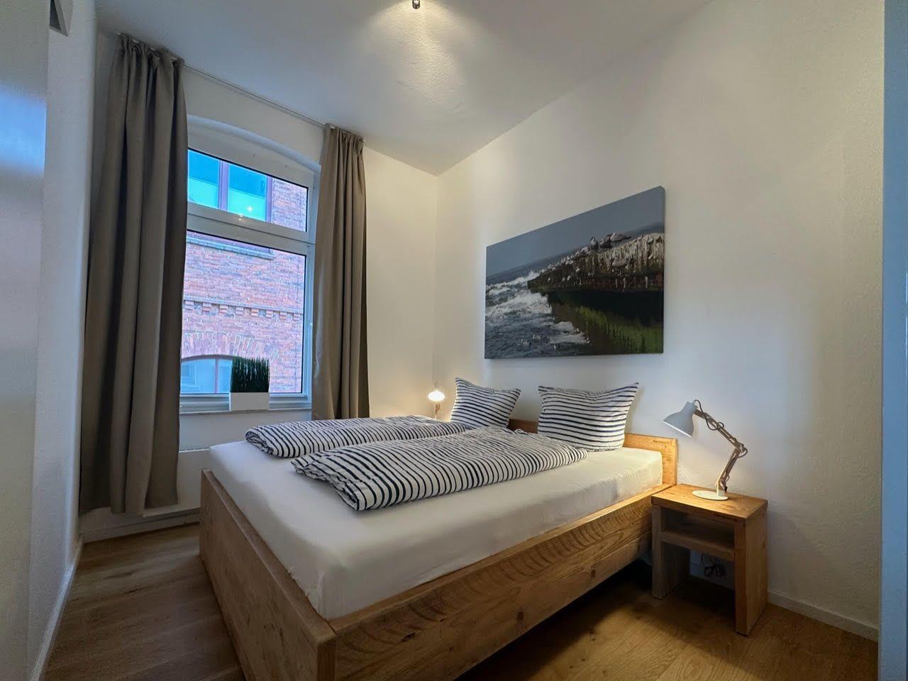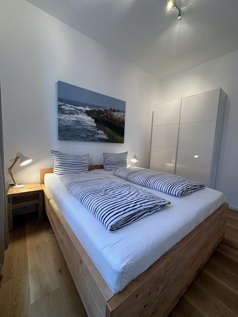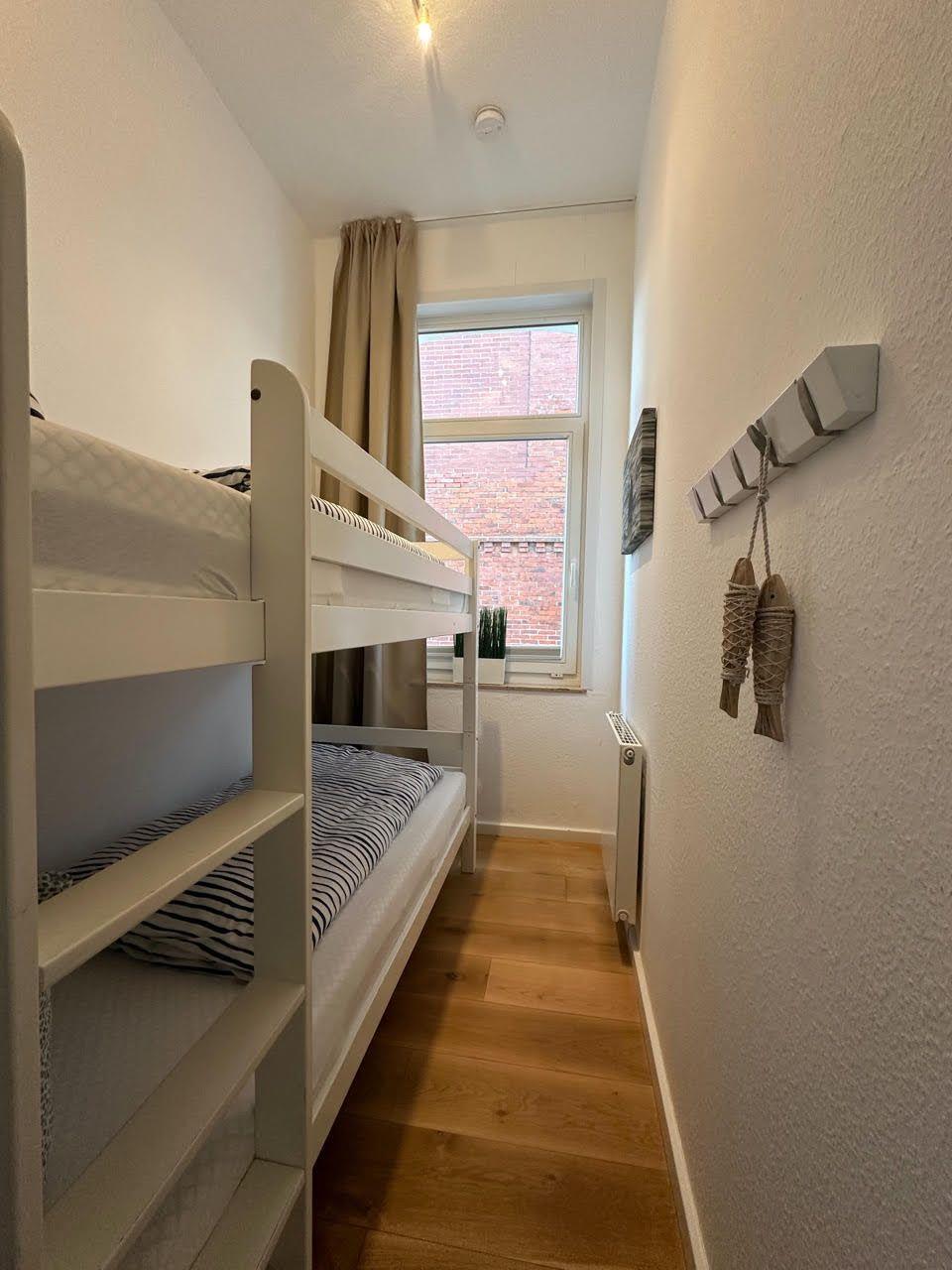 Die Wohnung verfügt über einen Wohnraum mit offener Küchenzeile. Die moderne Einbauküche ist voll ausgestattet mit einer Kaffeemaschine (Filter), einem Wasserkocher, einem Toaster, einer Mikrowelle sowie einem Ceranfeld mit vier Platten und einer praktischen Spülmaschine. Ein Kühlschrank mit Eisfach vervollständigt die Küchenausstattung. Das große Schlafzimmer verfügt über ein Doppelbett. Für die jüngeren Gäste steht ein kleines Zimmer mit einem Etagenbett bereit, welches speziell für Kinder konzipiert wurde und nicht für Erwachsene geeignet ist. Das Bad ist modern eingerichtet und bietet eine Dusche sowie ein WC. Die Einrichtung der Wohnung zeichnet sich durch hohe Decken, durch Echtholzparkett, durch eine moderne Einbauküche und durch einige maritime Dekorationen aus.