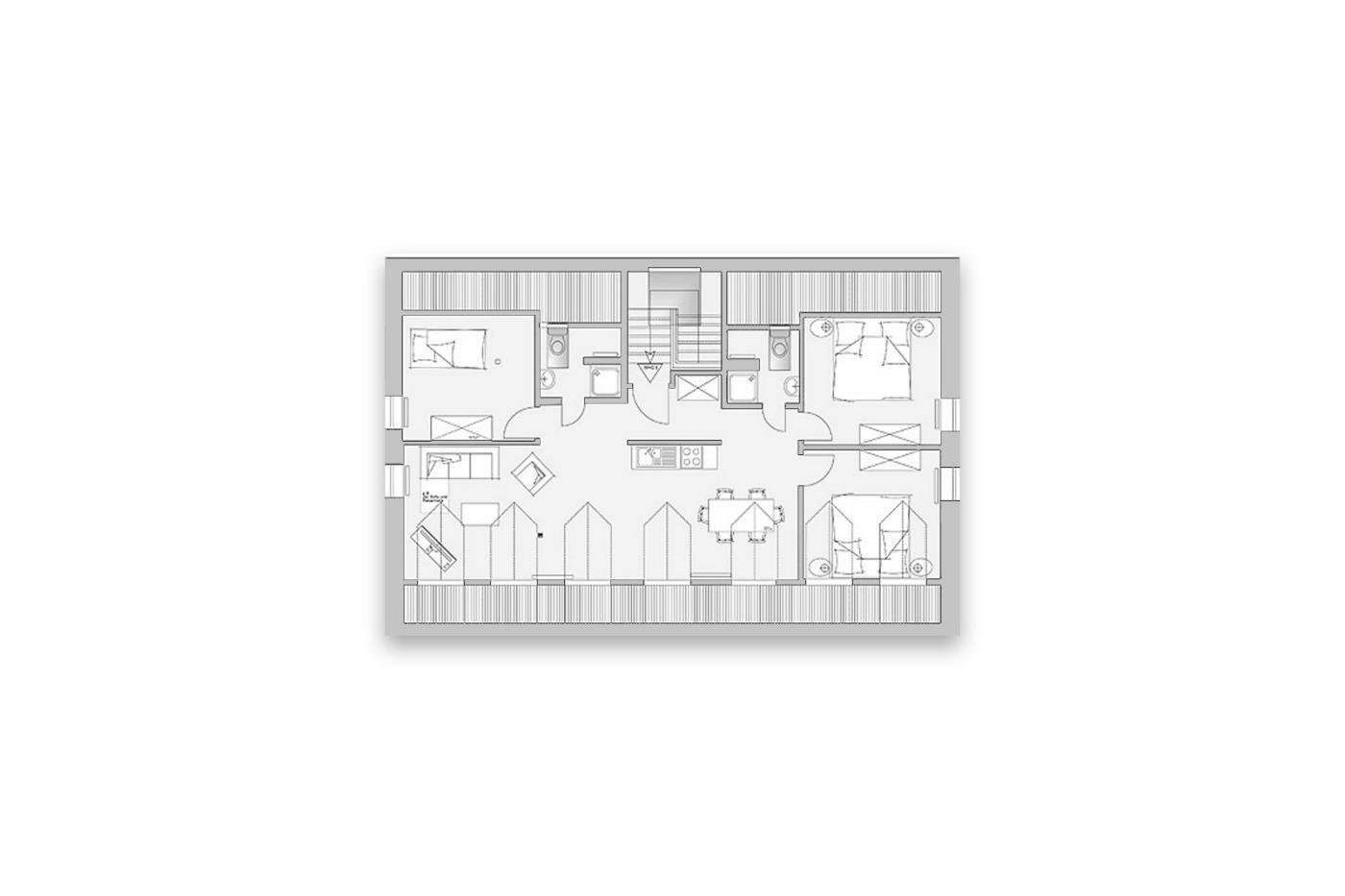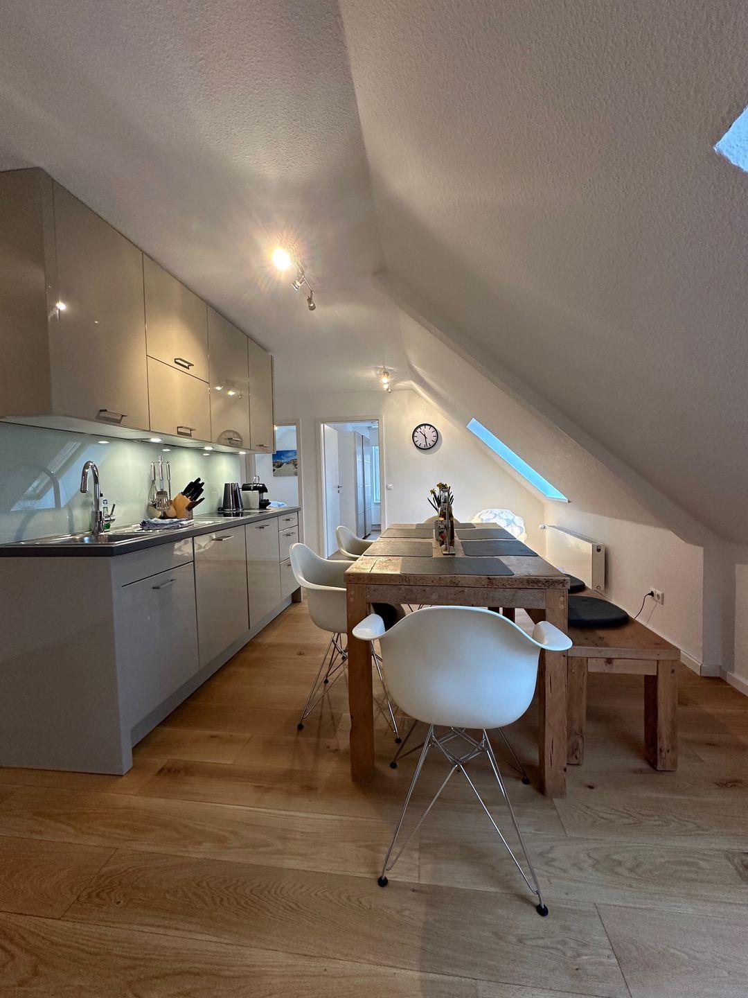 Das Interieur präsentiert sich mit hohen Decken und Echtholzparkett. Die Wohnung verfügt über drei Schlafzimmer. Alle Schlafzimmer sind mit Doppelbetten ausgestattet. Der offene Wohnraum mit Küchenzeile ist der zentrale Punkt der Wohnung. Die moderne Einbauküche verfügt über eine Kaffeemaschine (Filter), einen Wasserkocher, einen Toaster, eine Mikrowelle sowie ein Ceranfeld mit vier Platten und eine Spülmaschine. Ein Kühlschrank mit Eisfach vervollständigt die Küchenausstattung.