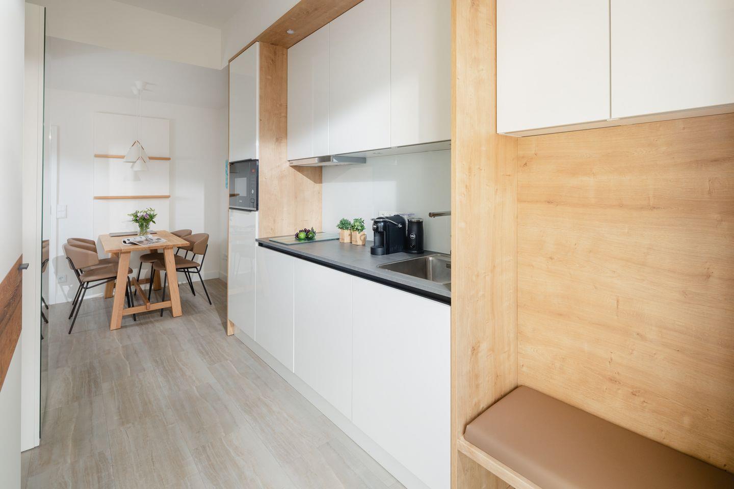 Erdgeschoss mit Wintergarten: Die Wohnung E9 liegt im Erdgeschoss (Achtung: nicht stufenlos erreichbar) und verfügt über einen Wintergarten mit Klimaanlage und Fußbodenheizung. Zur Ausstattung der Küche gehören unter anderem ein 2-Platten-Herd sowie eine Mikrowelle, ein Geschirrspüler, eine Filterkaffeemaschine und eine Kapselkaffeemaschine. Fahrräder der Hausgäste können im Innenhof abgestellt werden; Waschmaschine und Wäschetrockner stehen zur gemeinschaftlichen Nutzung im Untergeschoss bereit.
