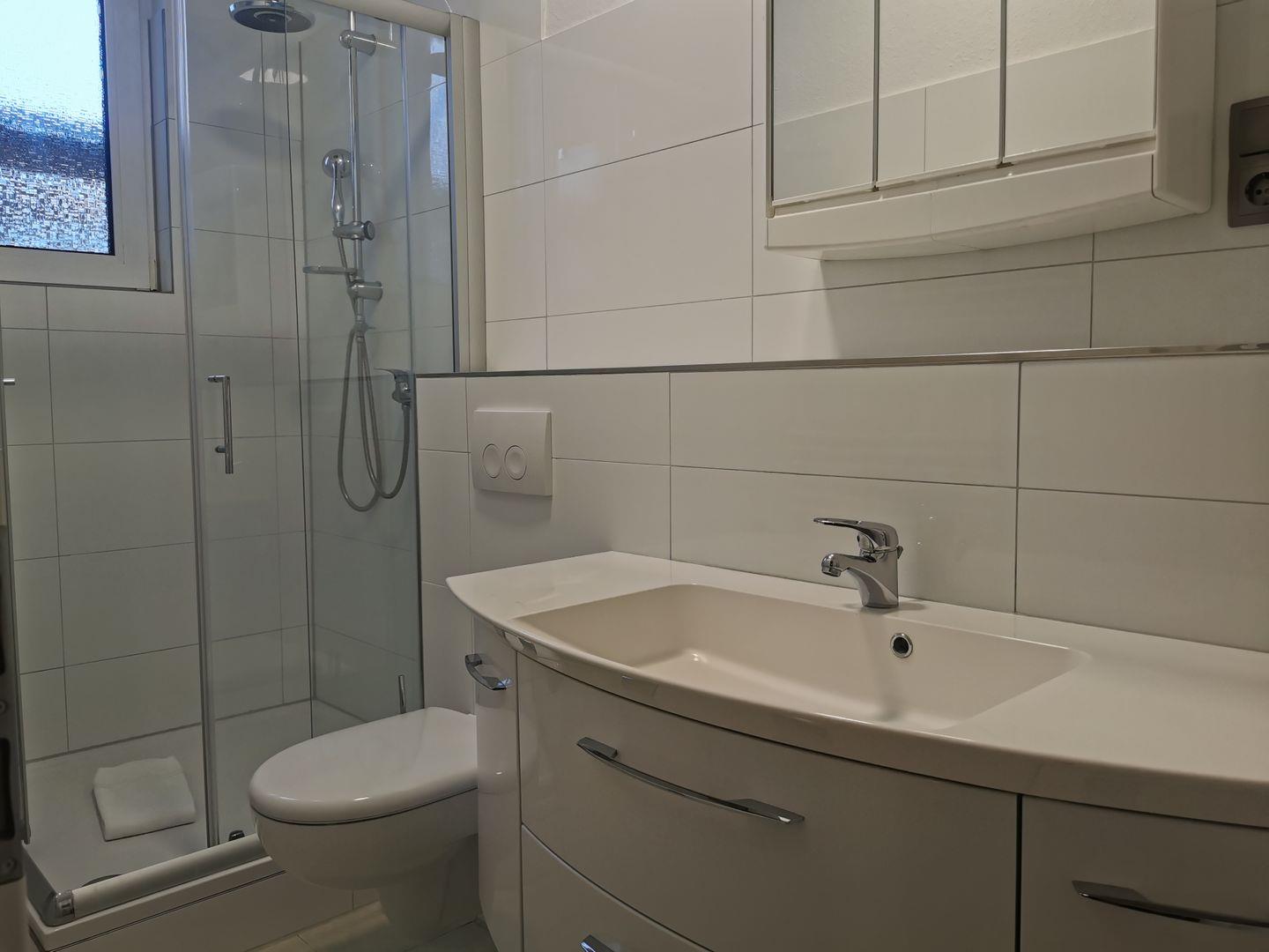 Im Erdgeschoss unter der Treppe ist der Essplatz für 4 Personen mit Blick auf das Wohnzimmer. Die komplett ausgestattete Küche ist separat. Das Maisonnette-Appartement verfügt über 2 Tageslichtbäder mit Dusche/WC im Erdgeschoss. Separater Eingang hinter dem Haus.