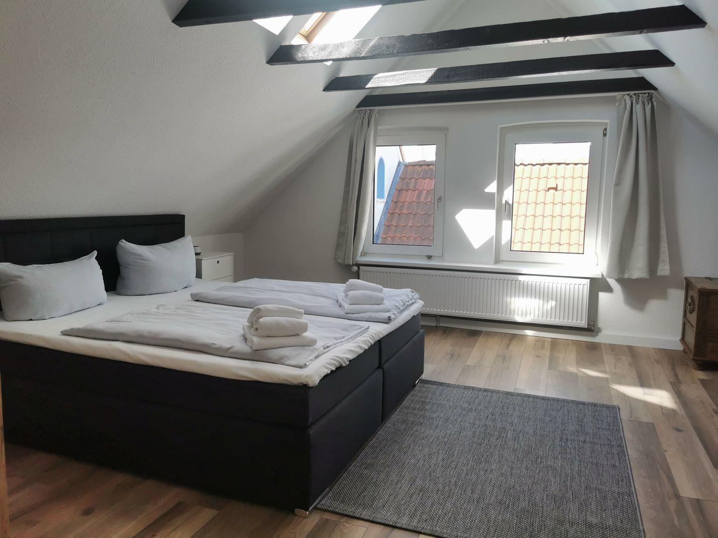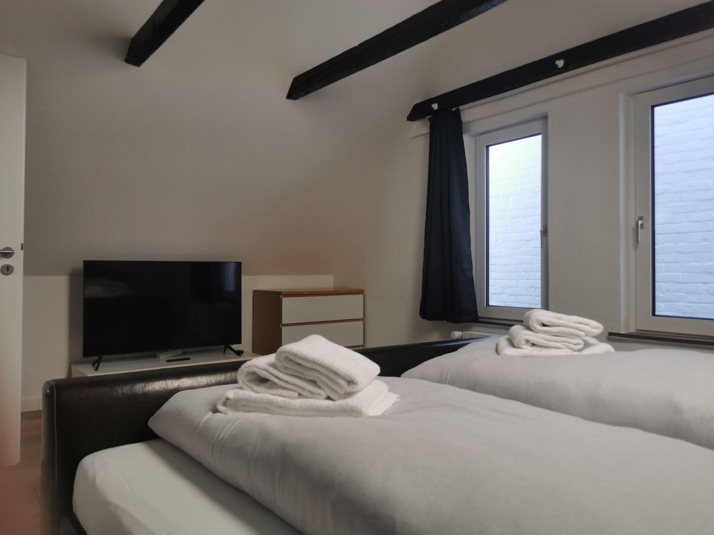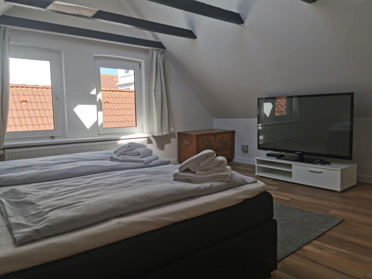 die beiden geräumigen Schlafzimmer mit Doppelbett (+TV) und der Zugang zur Dachterrasse befinden sich im Dachgiebel des Hauses. Über einen kleinen Treppenabsatz können Sie die Dachterrasse betreten.