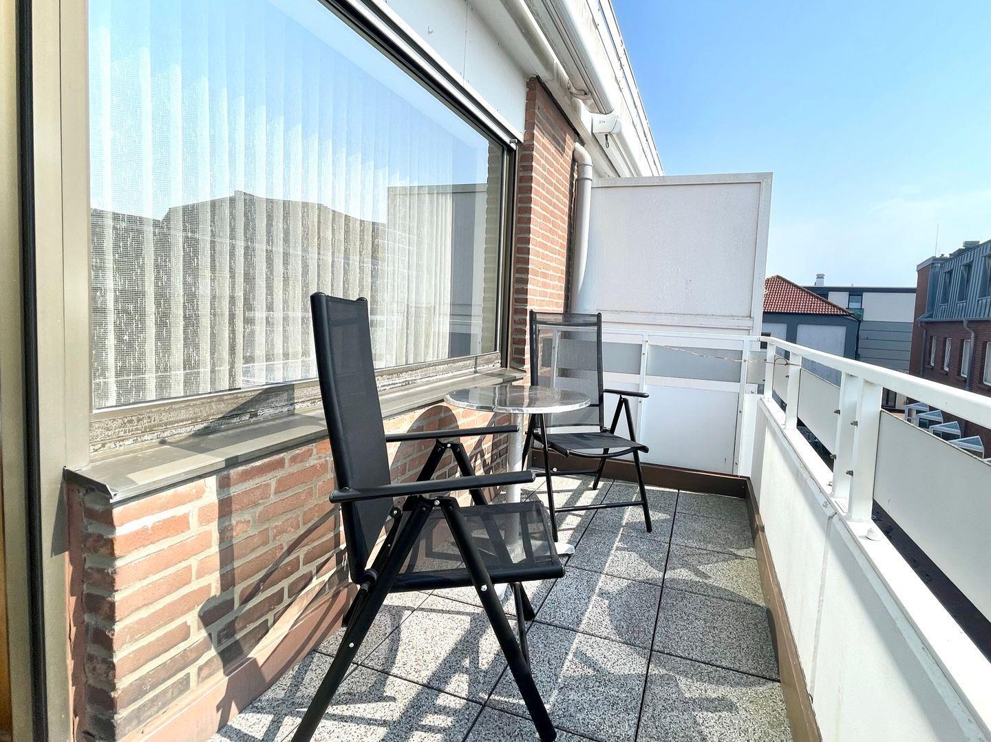Die 1-Zimmer-Wohnung Nr. 20 verfügt über einen großen Balkon mit Markise. Dieses Apartment ist für max. 3 Personen geeignet und verfügt über zwei Schrankbetten und ein Einzelbett.