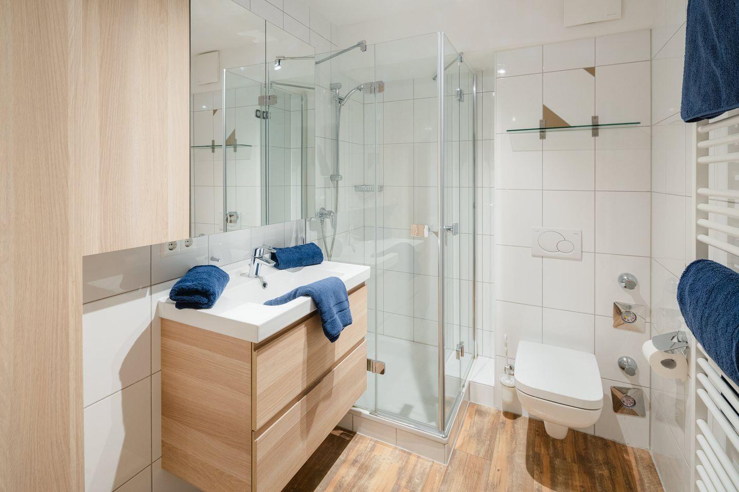 Es gibt zwei Schlafzimmer: Ein Hauptschlafzimmer mit einem komfortablen Boxspringbett (180x200 cm) und ein weiteres Schlafzimmer mit einem Einzelbett (90x200cm) und einem Fenster, das zum Flur führt. Das Badezimmer ist modern ausgestattet mit Dusche, Waschbecken und WC.