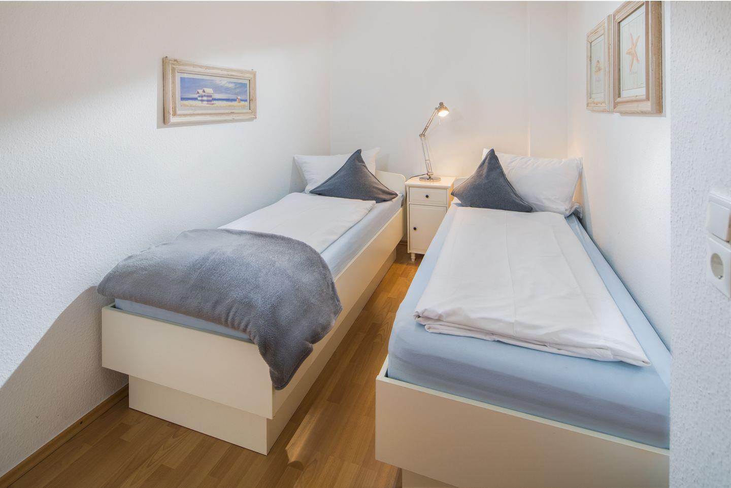 Das Hauptschlafzimmer ist mit einem großzügigen Boxspringbett (180x200 cm) ausgestattet, das für erholsamen Schlaf sorgt. Im zweiten Schlafzimmer stehen zwei gemütliche Einzelbetten (90x200cm) zur Verfügung. Dieses Zimmer hat ein Fenster, das zum Flur führt. Das moderne Badezimmer bietet eine Dusche, ein Waschbecken und ein WC.