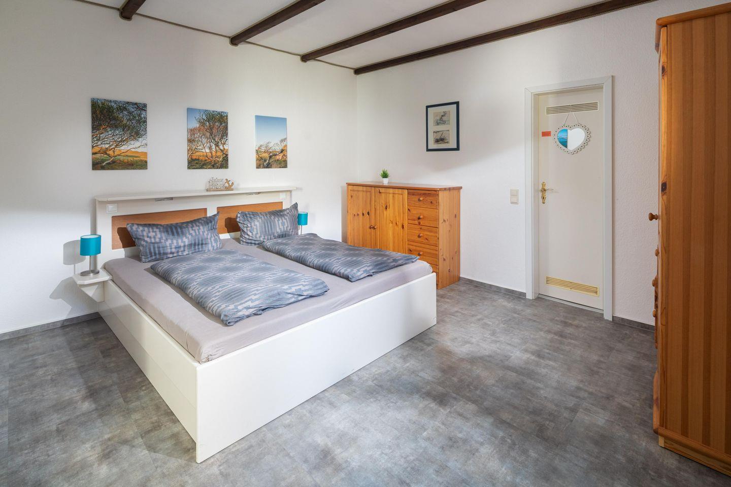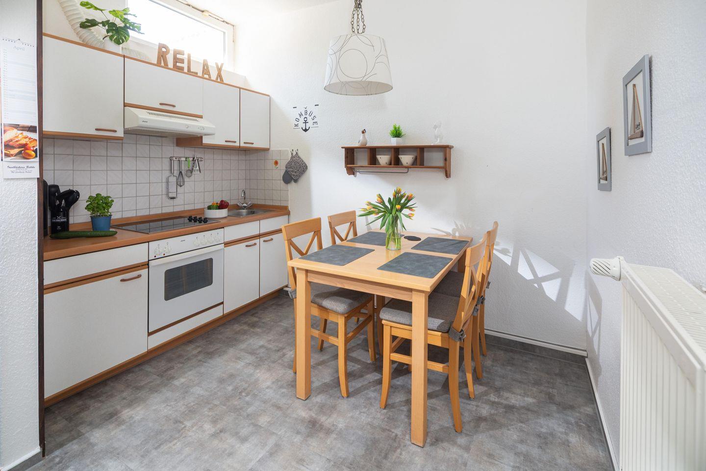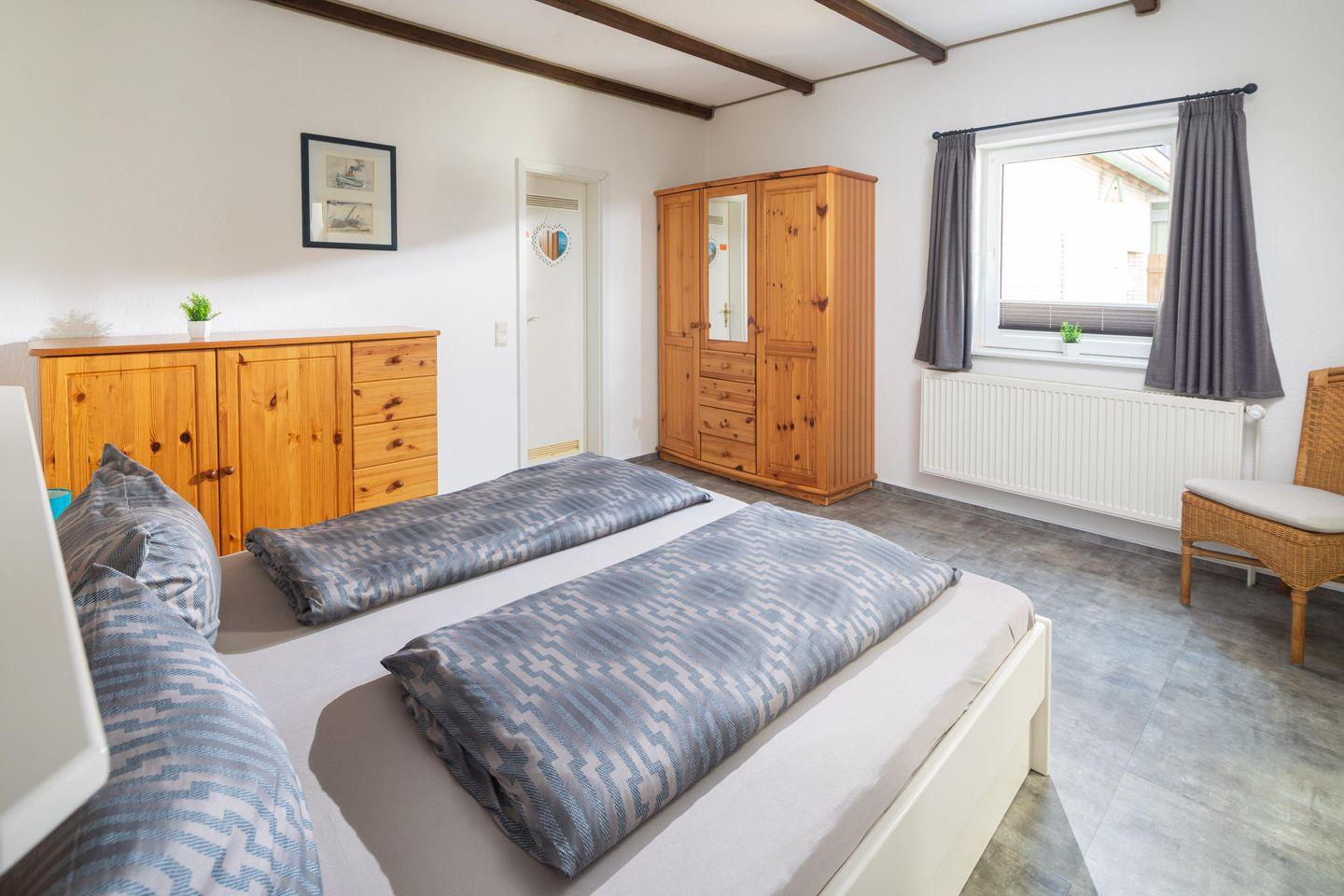 Die 2-Raum-Ferienwohnung liegt im Erdgeschoss und verfügt über einen Wohnraum mit Schlafsofa (150x200cm), ein separates Schlafzimmer mit Ehebett 180x200 cm (zwei separate Matratzen 90x200cm), Kabel-TV, Küchenzeile (4-Plattenherd, Backofen), Essecke und Dusche/WC.