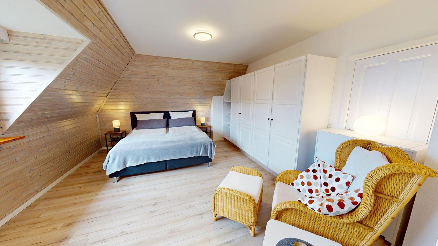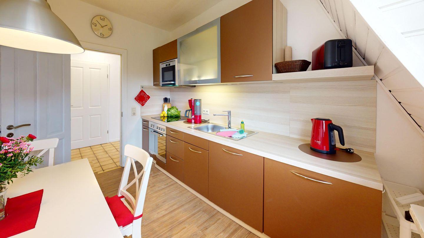 Die Wohnung bietet ein Schlafzimmer mit Doppelbett und ein Wohnzimmer mit einer Sitzecke. Für zusätzliche Gäste steht die Schlafcouch im Wohnbereich bereit, die Platz für bis zu 2 Personen bietet. Zudem ist eine separate Küche (voll ausgestattet) mit einem Essbereich vorhanden. Das Badezimmer ist mit einer Dusche und einer Badewanne eingerichtet. Hier darf auch der vierbeinige Freund mitkommen, denn die Ferienwohnung heißt auch Hunde herzlich willkommen. Erlaubt ist maximal 1 Hund (Höhe maximal kniehoch). Die Hundewiese befindet sich in der Nähe des Fährhafens (kein Leinenzwang).
