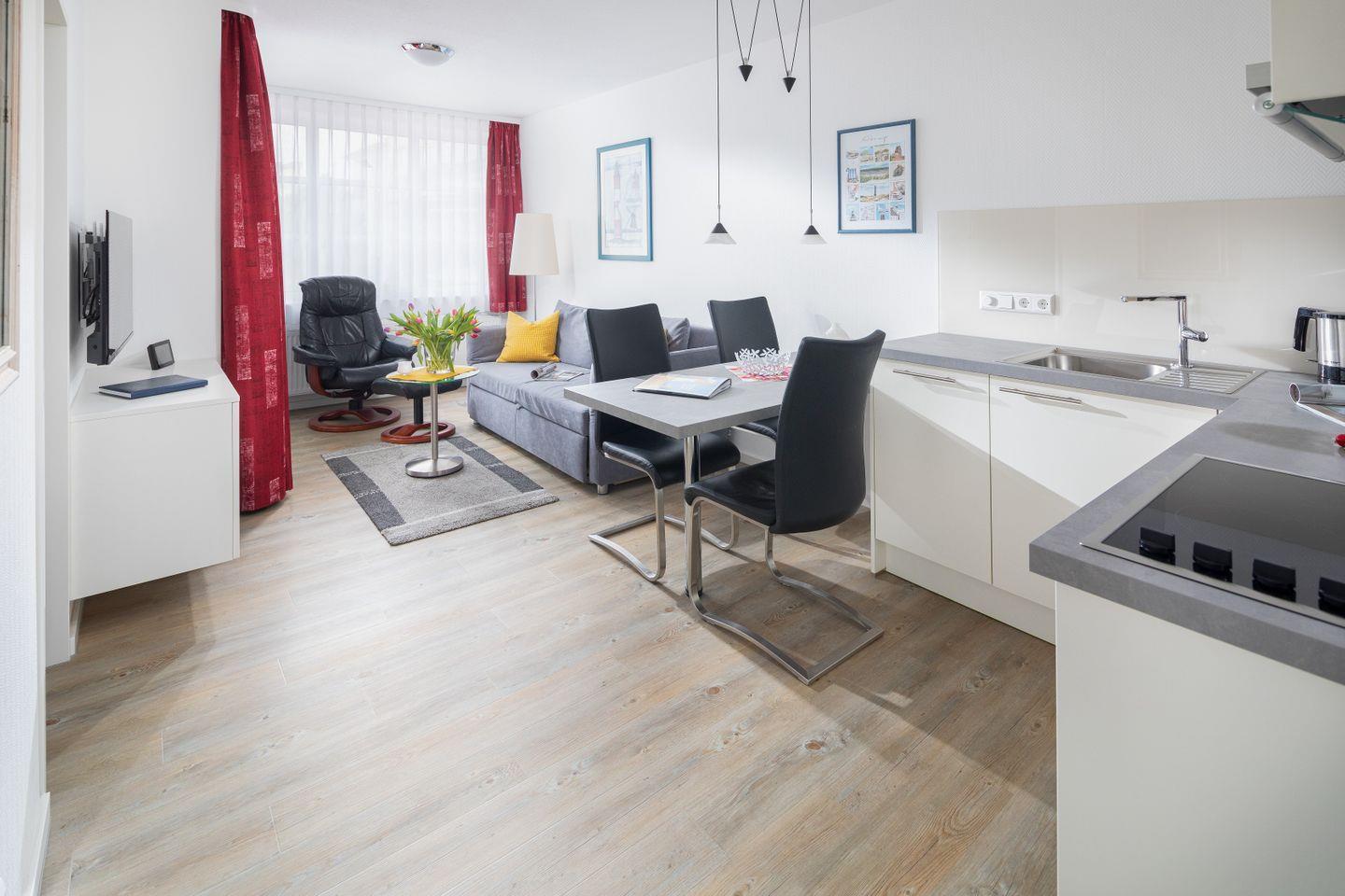Die im Wohnzimmer integrierter Küchenzeile ist ausgestattet mit Geschirrspüler, Mikrowelle, Kühlschrank, Cerankochfeld sowie Toaster, Kaffeemaschine und einem Wasserkocher.