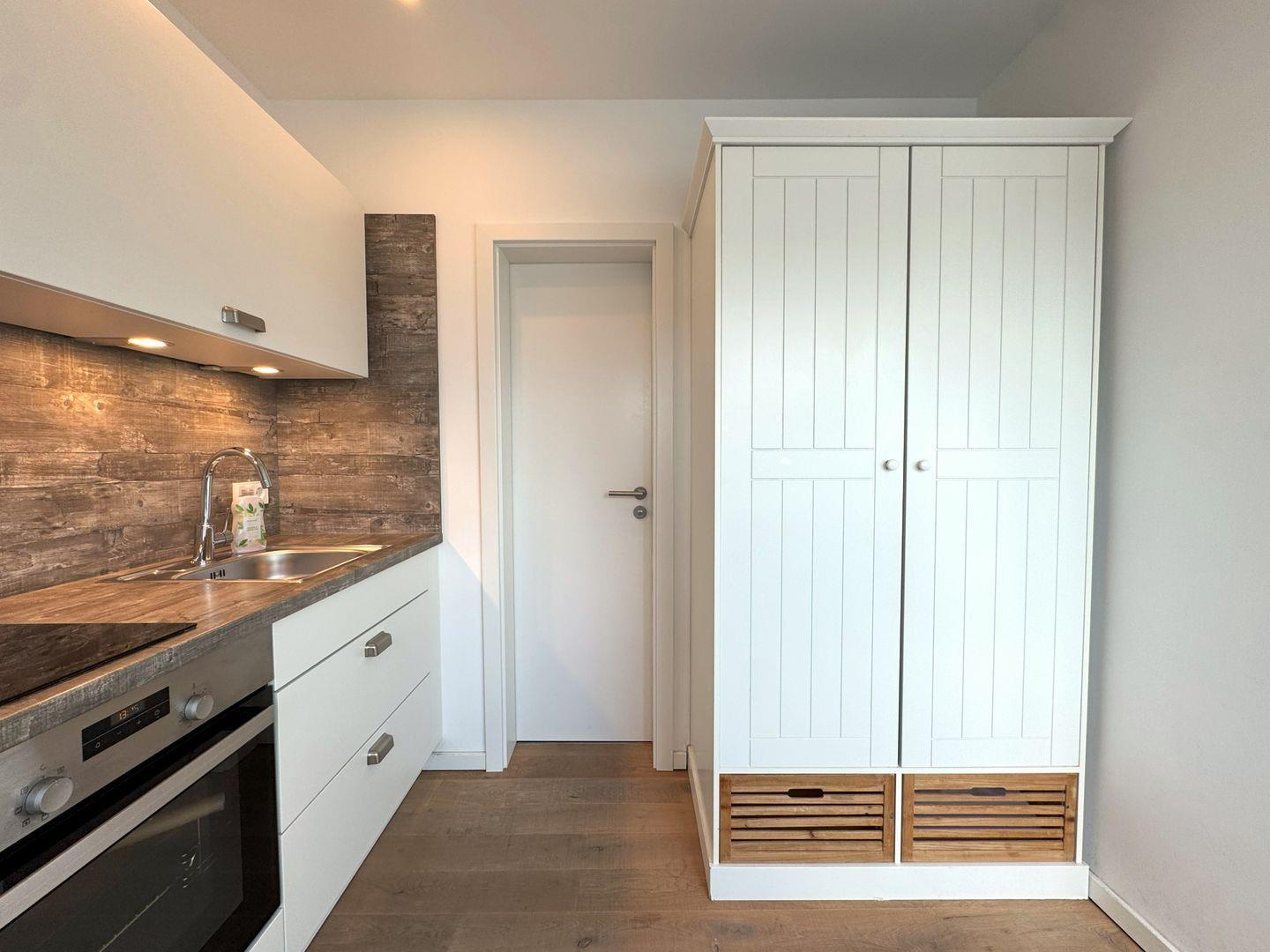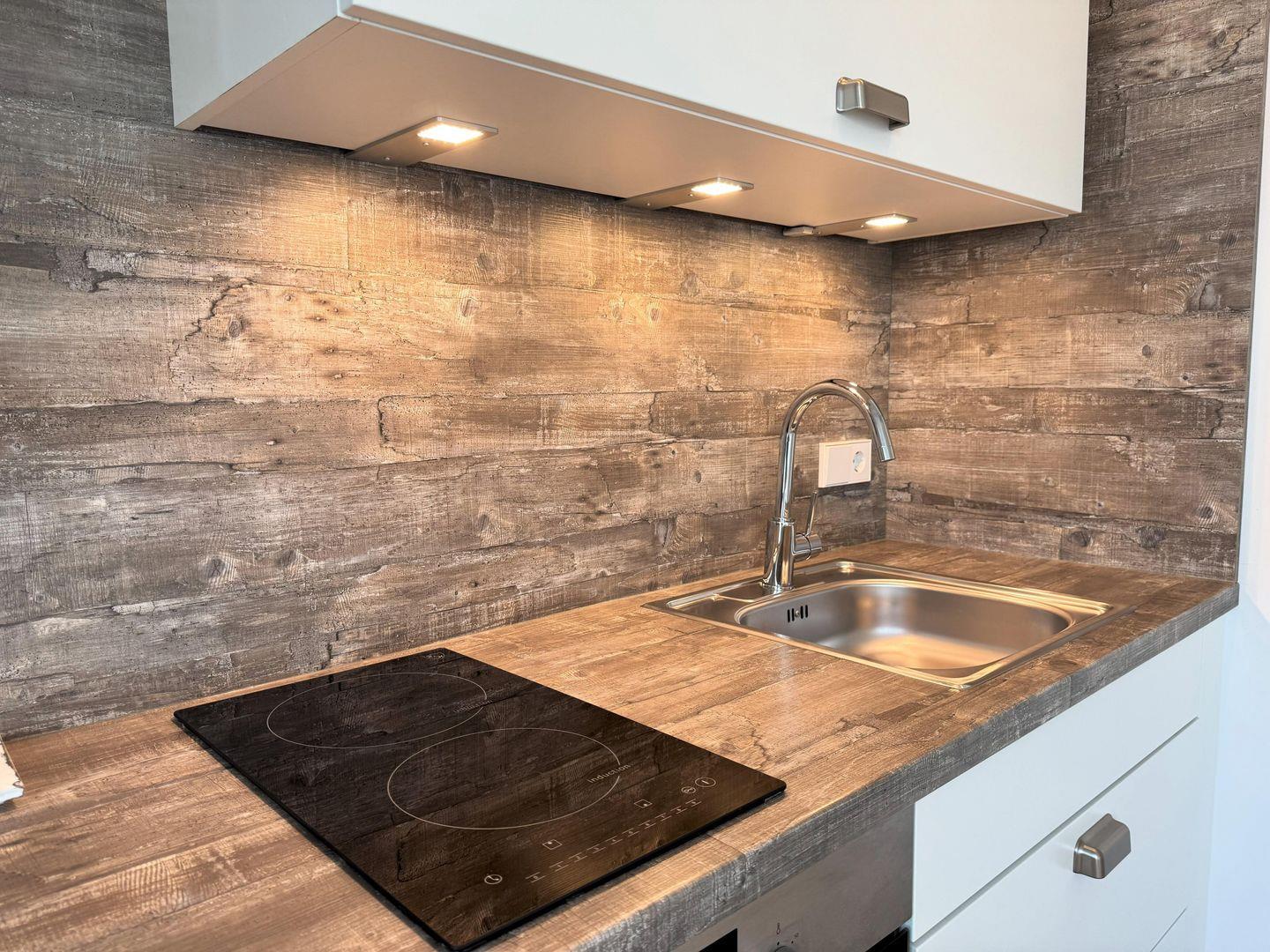 Das Appartement zeichnet sich durch eine offene Küche aus, die zusammen mit dem Wohnzimmer eine helle und freundliche Atmosphäre schafft. Der Raum ist liebevoll eingerichtet und mit einem Echtholzparkett ausgestattet, das nicht nur stilvoll aussieht, sondern auch eine warme Gemütlichkeit ausstrahlt. In der gut ausgestatteten Küchenzeile finden Sie alles, was Sie für die Zubereitung Ihrer Lieblingsgerichte benötigen. Dazu gehören ein 2-Platten-Herd, ein Backofen, ein Kühlschrank mit integriertem Gefrierfach sowie eine Kaffeemaschine, Toaster und ein Wasserkocher. Geschirr, Besteck und Küchenutensilien sind ebenfalls vorhanden, damit Sie sich wie zu Hause fühlen können.